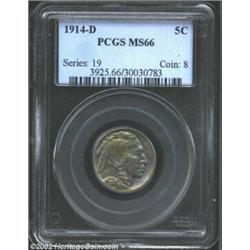 1914-D 5C MS66 PCGS. The 1914-D (3.9 million pieces), while undeniably scarce in Mint State, is one of the more plentiful early Buffalo Nickels at that level of preservation. Premium quality Gems, of course, are rare with PCGS reporting just 25 coins in MS66 and a mere four finer (10/02). The eye appeal of the present representative is nothing short of breathtaking. Frosty textured and sharply impressed features are fully appreciable beneath layers of blue-gray, orange, gold, and reddish-lilac patina. There is not a single bothersome abrasion; a die crack (as struck) is noted on the obverse over the Indian's jaw.From the BTB Collection of Buffalo Nickels. Important notice: We expect to be auctioning lots at the rate of 200-250 per hour. Sometimes eBay Premier live bid software cannot keep up with that pace, so we strongly recommend that you place a realistic proxy bid now as insurance to avoid disappointment. Also please note that all Heritage/CAA lots purchased through eBay Premier carry a 20% Buyer's Premium. Please make sure you read the Terms and Conditions.