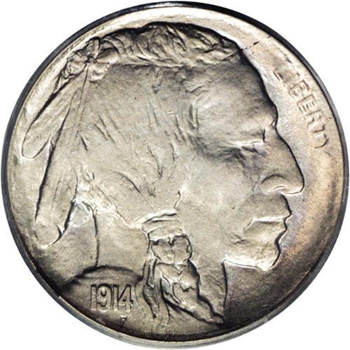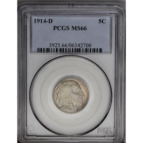 <B>1914-D<5C> MS66 PCGS.</B></I> This is a lovely Gem quality example that approaches the finest available quality for the date. Both sides have sharp design features, although it is not fully struck. The surfaces are frosty and lustrous with pale gold color and iridescent toning near the borders. Population: 34 in 66, 4 finer (4/06).