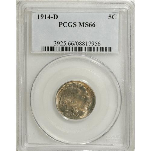 <B>1914-D 5C MS66 PCGS.</B></I> This is a lovely specimen with frosty luster shining through warm gold and pale blue toning across both surfaces. The design motifs have nearly full definition with only the slightest weakness in the usual locations. Population: 36 in 66, 5 finer (3/07).<BR><BR><b>Shipping:</b> Coins & Currency (<a target="_blank" href="http://www.heritageauctions.com/common/shipping.php">view shipping information</a>)