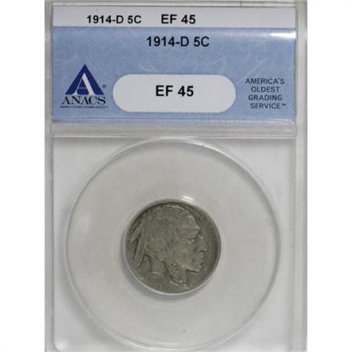 <B>1914-D 5C XF45 ANACS.</B></I> . NGC Census: (20/639). PCGS Population (35/934). Mintage: 3,912,000. Numismedia Wsl. Price for NGC/PCGS coin in XF45: $243. (#3925)<BR><BR><B>Coin Engraver:</B> James E. Fraser<BR><BR><b>Shipping:</b> Coins & Currency (<a target="_blank" href="http://www.heritageauctions.com/common/shipping.php">view shipping information</a>)