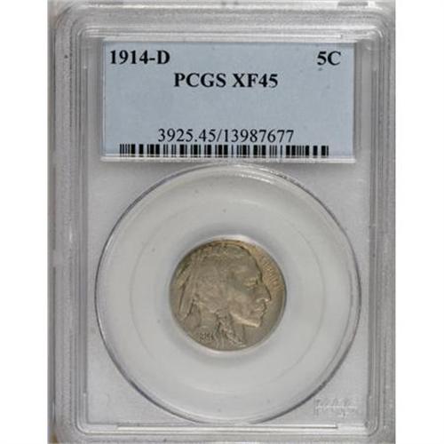 <B>1914-D 5C XF45 PCGS.</B></I> PCGS Population (34/917). NGC Census: (18/632). Mintage: 3,912,000. Numismedia Wsl. Price for NGC/PCGS coin in XF45: $236. (#3925)<BR><BR><B>Coin Engraver:</B> James E. Fraser<BR><BR><b>Shipping:</b> Coins & Currency (<a target="_blank" href="http://www.heritageauctions.com/common/shipping.php">view shipping information</a>)