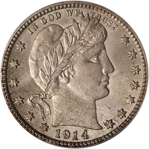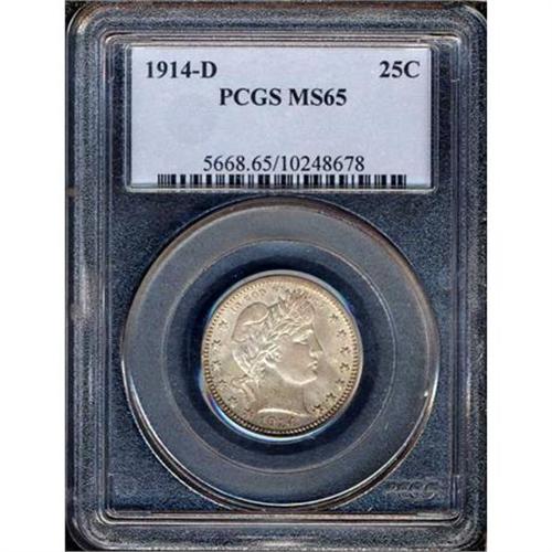 <b>1914-D Barber Quarter Dollar. PCGS graded MS65.</b> Swimming in mint brilliance over each side of this sharply made Gem. Both the peripheries and the central reverse are impressive for their sharpness of strike, and the frosty textured surfaces are fresh, original, attractive <b>(PCGS # 5668)</b> <i>