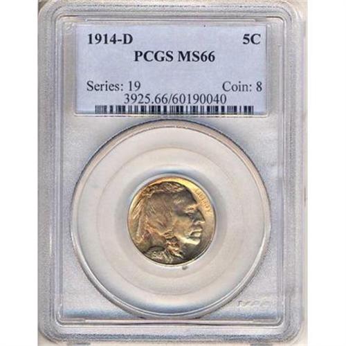 <b>1914-D Buffalo Nickel. PCGS graded MS66.</b> A solid gem in all regards. The satiny surfaces are alight with sizzling luster, the strike is clear-cut, and the eye appeal is nothing short of exceptional due to the light golden toning <b>(PCGS # 3925)</b>