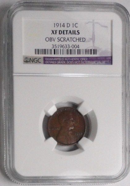 1914-D LINCOLN ONE CENT NGC XF MINOR OBV MARK, BARGAIN, EST. $550.00-$590.00