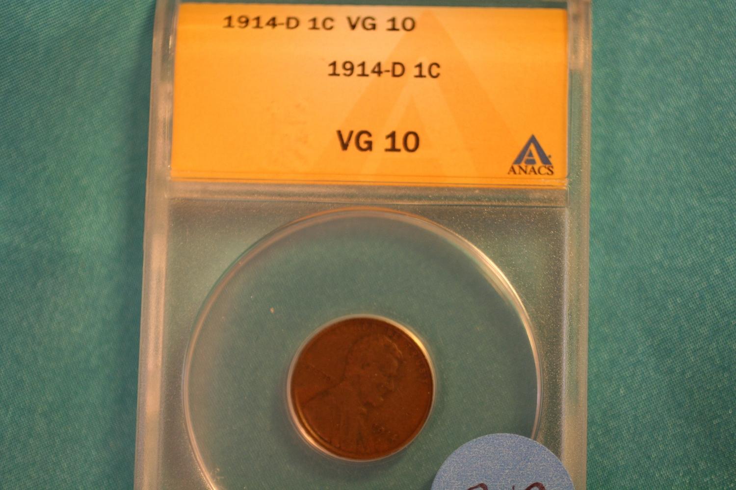 1914-D One Cent Coin (VG-10) ANACS Graded