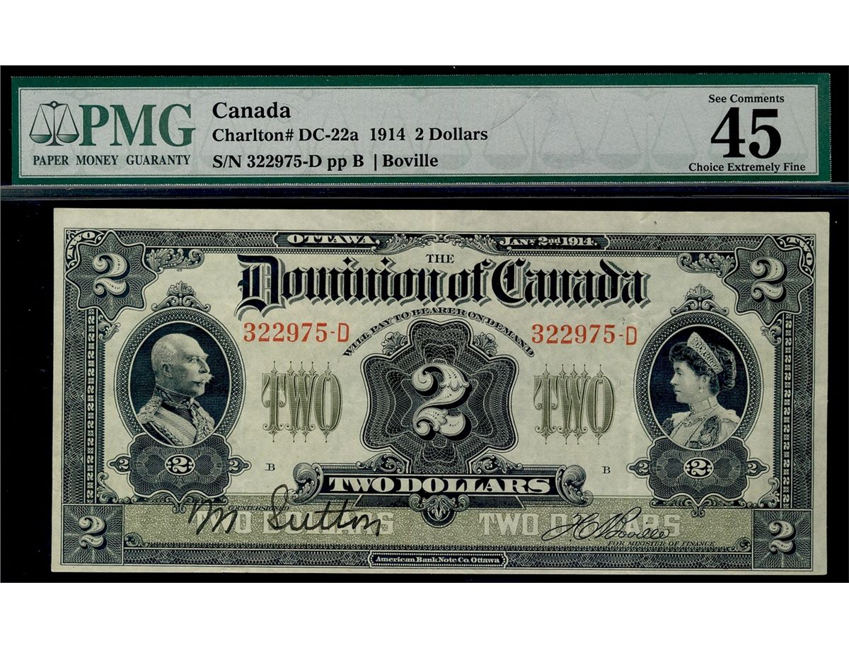 1914 Dominion of Canada; 2 Dollars, DC-22a PCGS EF45; #322975-D. Scarce in this condition.