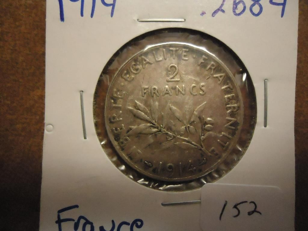 1914 FRANCE SILVER 2 FRANCS .2684 OZ. ASW