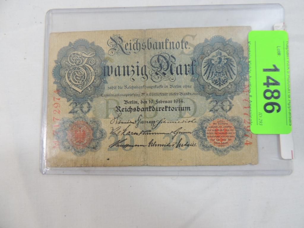 GERMAN 20 MARK BANKNOTE FROM 1914 GERMANY IMPERIAL REICHSBANKNOTE 20 MARK 1914 BANKNOTE FOREGIN CURRENCY AS SHOWN SEE PHOTO FOR MORE DETAILS.
