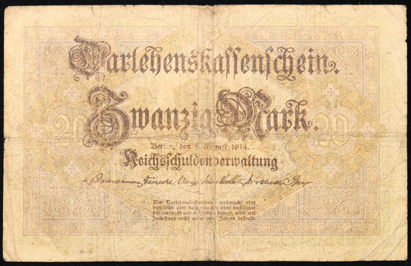 1914 Germany 20 Marks WW1 First Issue P# 48b Grades vf+. In August 1914, Directly after the onset of WW1, the German Empire removed the gold backing of the mark and issued new currency. After the fall of the German Empire in 1918, the newly formed German Weimar Republic issued another new currency, known derisively as the "Paper Mark", which faced massive hyperinflation. A Corey's Pick