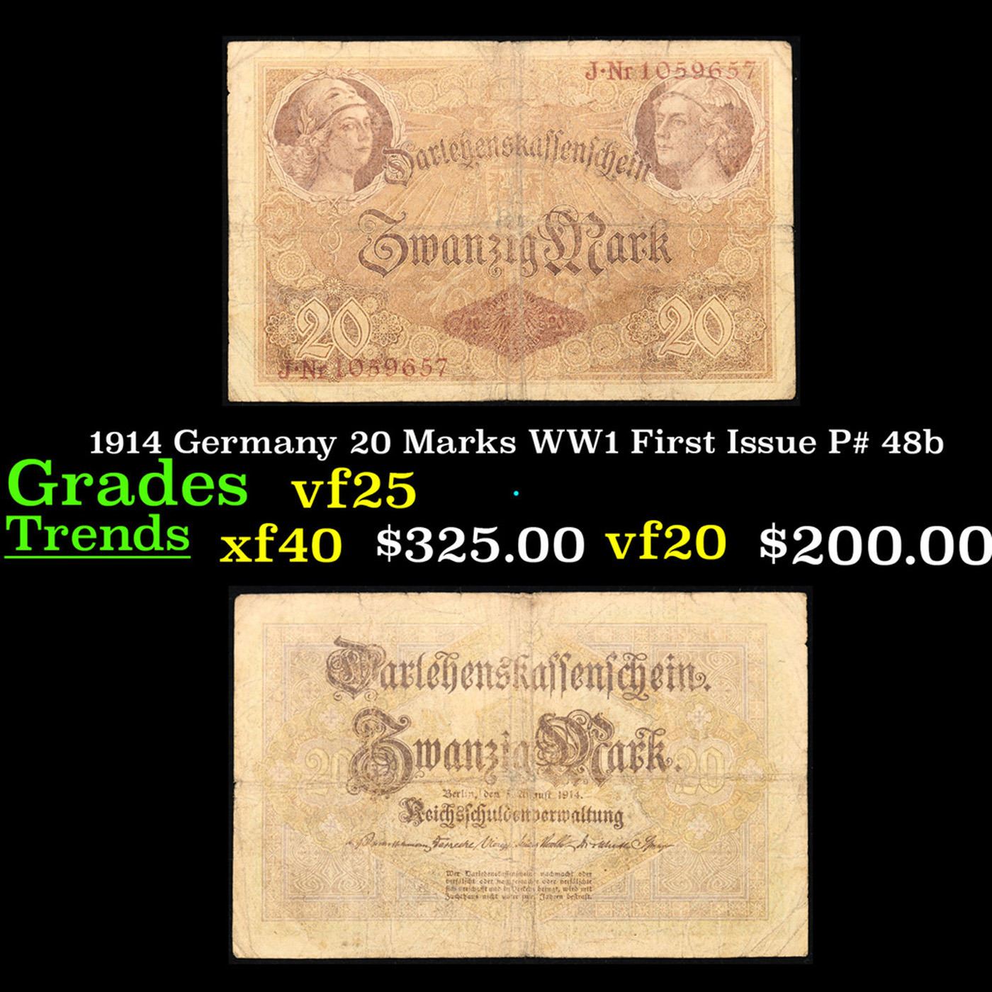 1914 Germany 20 Marks WW1 First Issue P# 48b Grades vf+. In August 1914, Directly after the onset of WW1, the German Empire removed the gold backing of the mark and issued new currency. After the fall of the German Empire in 1918, the newly formed German Weimar Republic issued another new currency, known derisively as the "Paper Mark", which faced massive hyperinflation. A Key Date's Pick