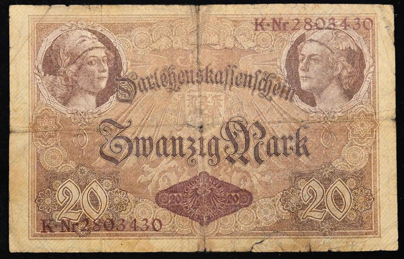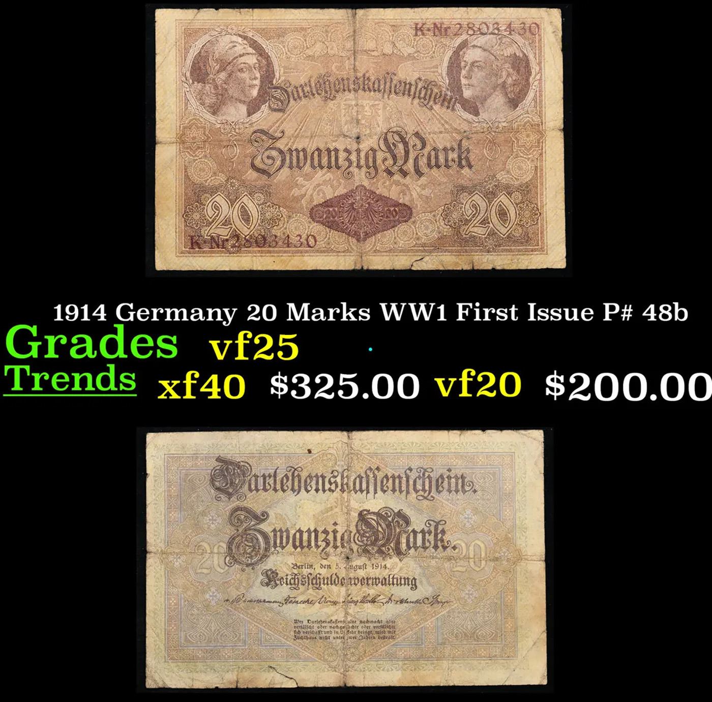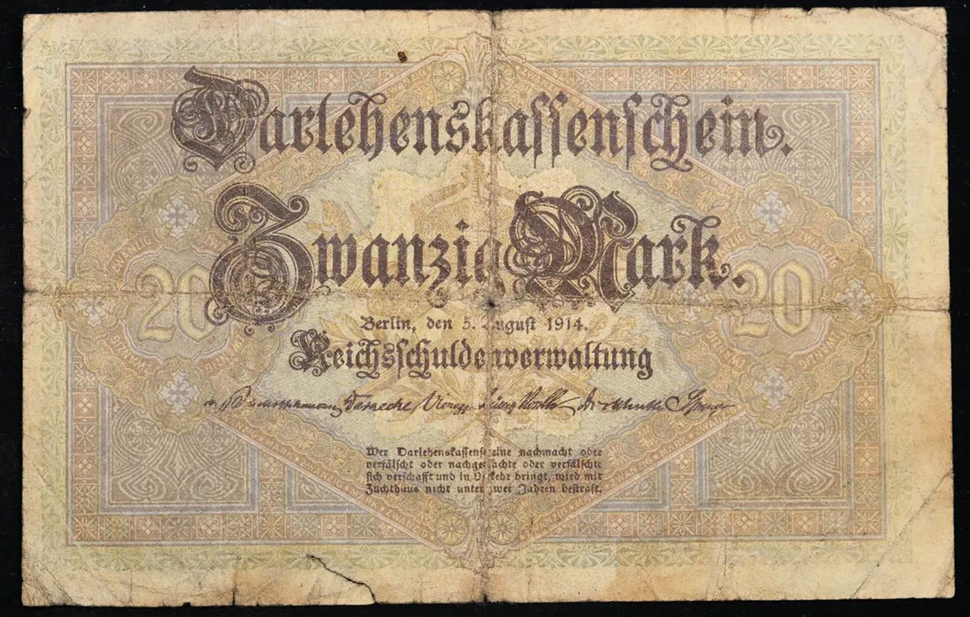 1914 Germany 20 Marks WW1 First Issue P# 48b Grades vf+. In August 1914, Directly after the onset of WW1, the German Empire removed the gold backing of the mark and issued new currency. After the fall of the German Empire in 1918, the newly formed German Weimar Republic issued another new currency, known derisively as the "Paper Mark", which faced massive hyperinflation.