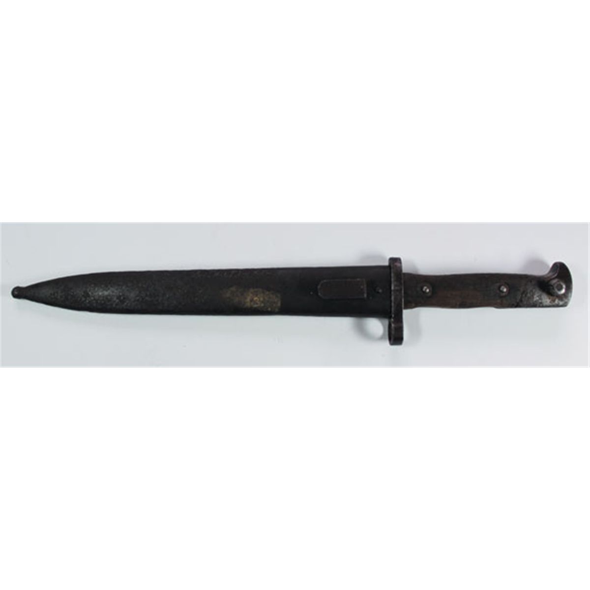1895 pattern, Austrian made mannlicher bayonet with matching scabbard. OEWG (Osterreichische Waffenfabrik Gesellschaft) markings on blade ricasso and scabbard frog stud. Brought into Ireland on the Asgard as part of the Howth gun running on 26 July 1914.