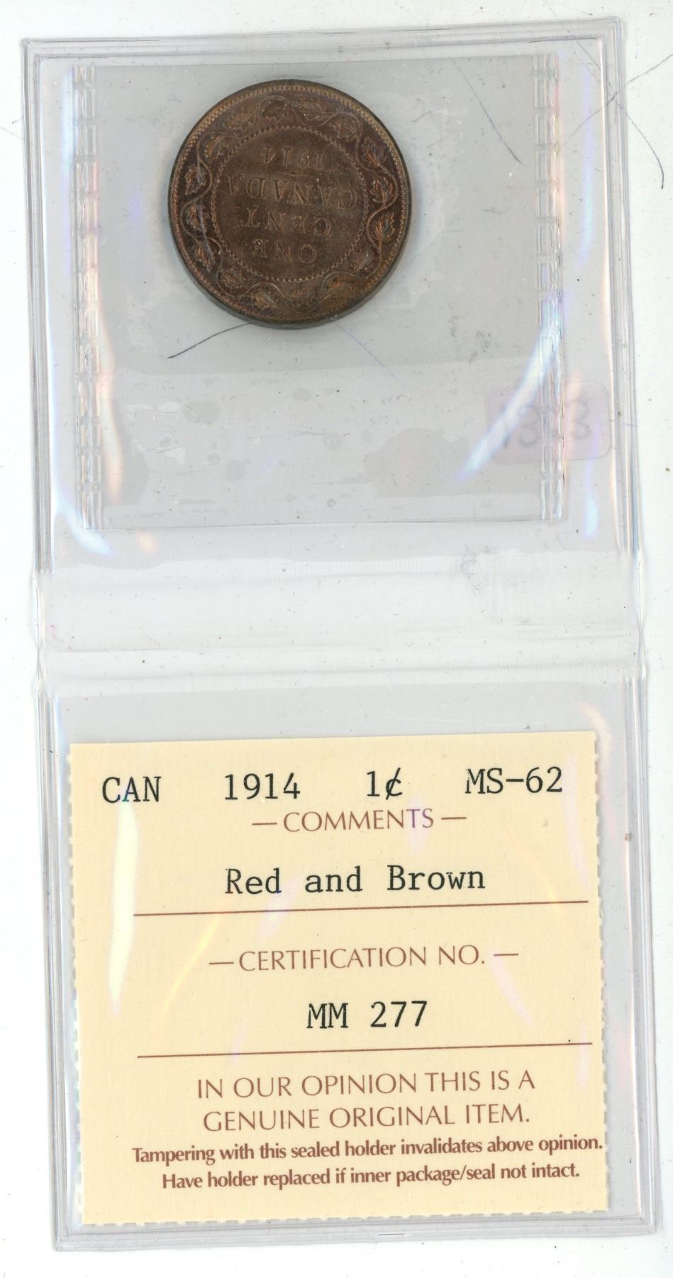 1914 ICCS graded, Canadian large cent coin - MS62