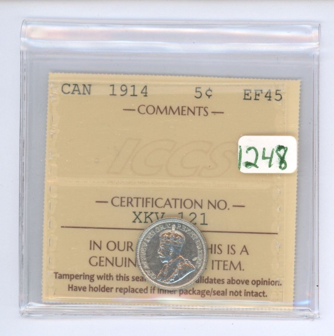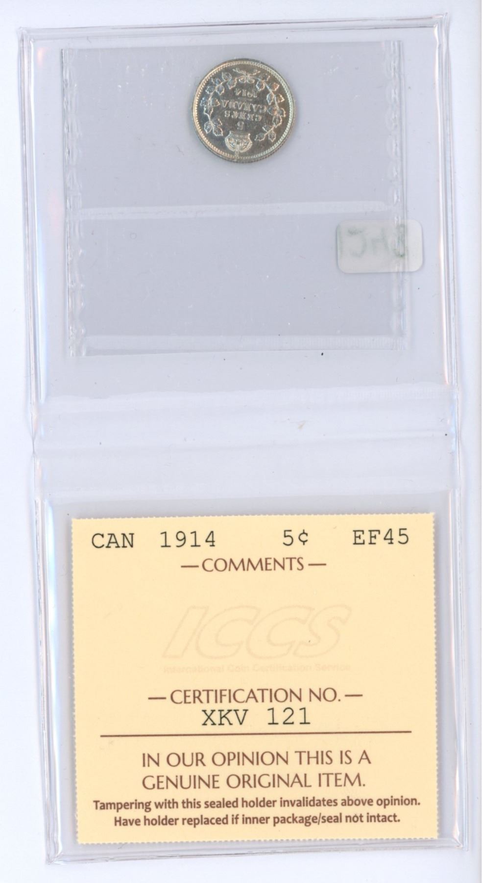 1914 ICCS graded, Canadian silver 5 cent coin - EF45