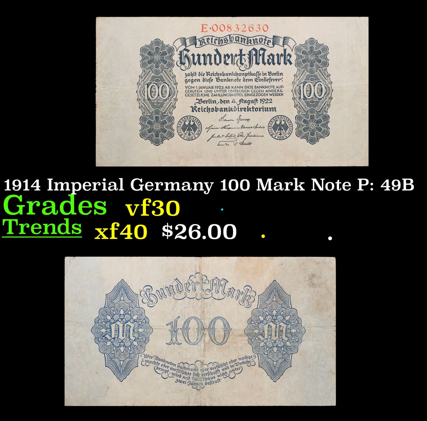 1914 Imperial Germany 100 Mark Note P: 49B Grades vf++.