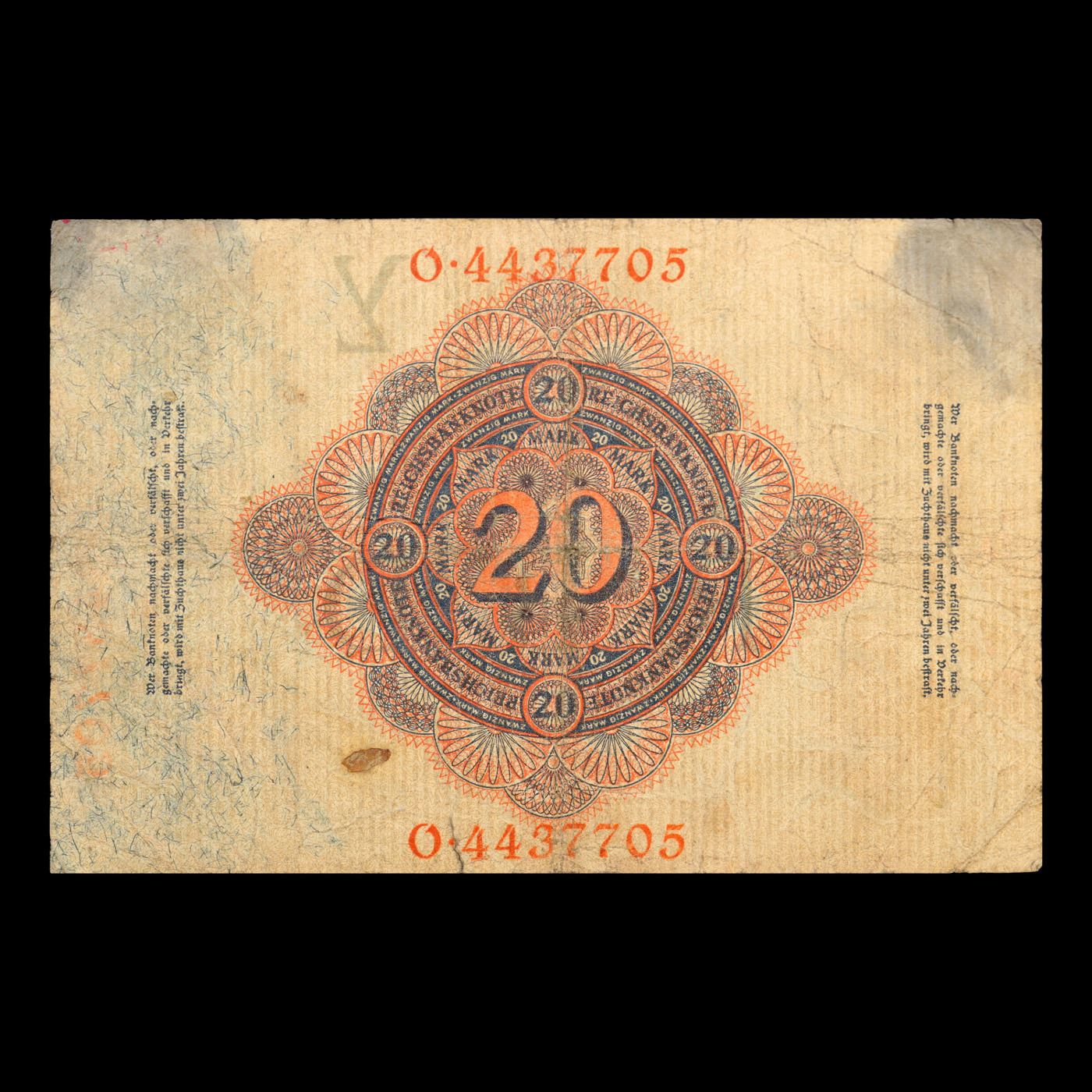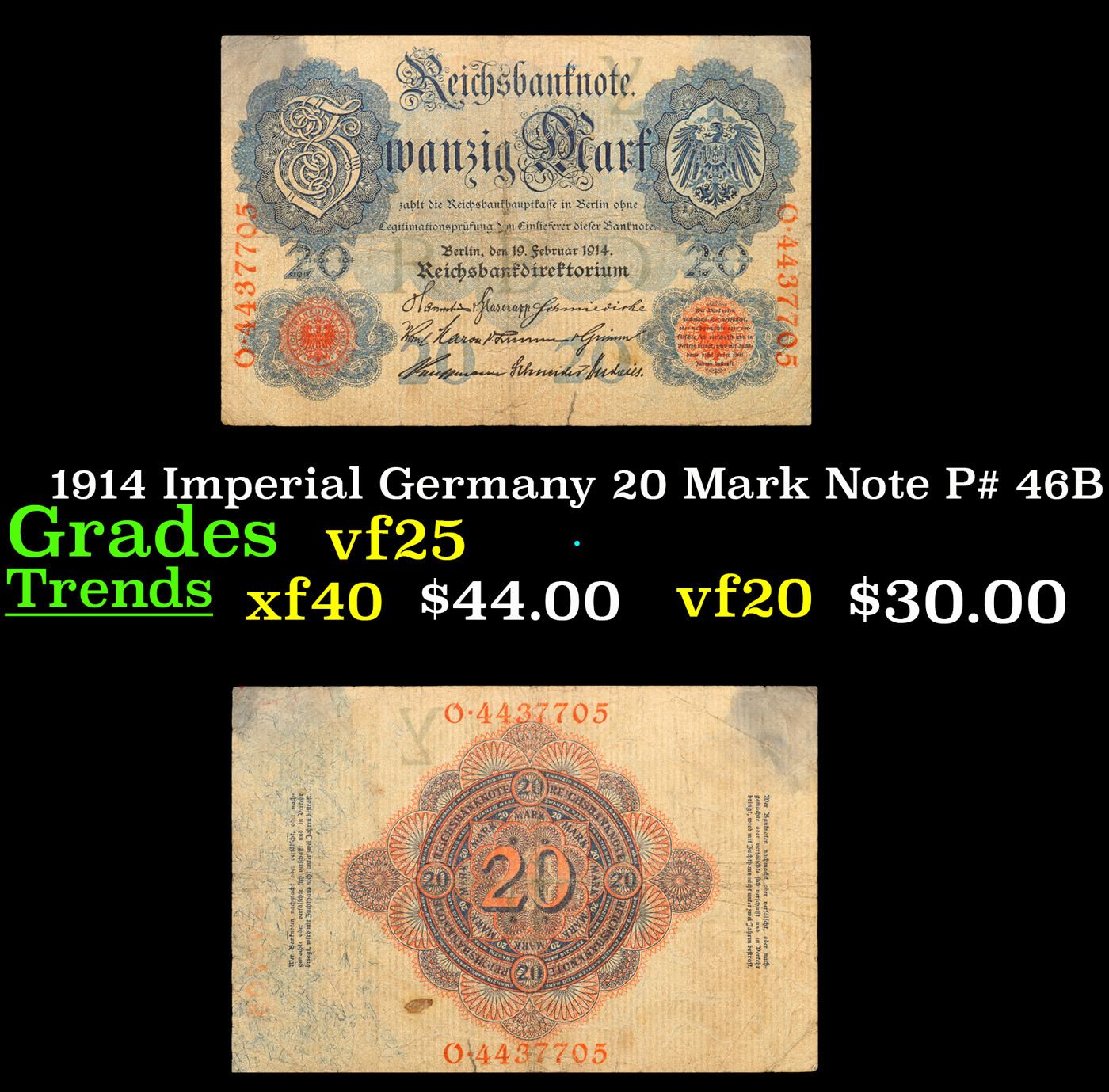 1914 Imperial Germany 20 Mark Note P# 46B Grades vf+.