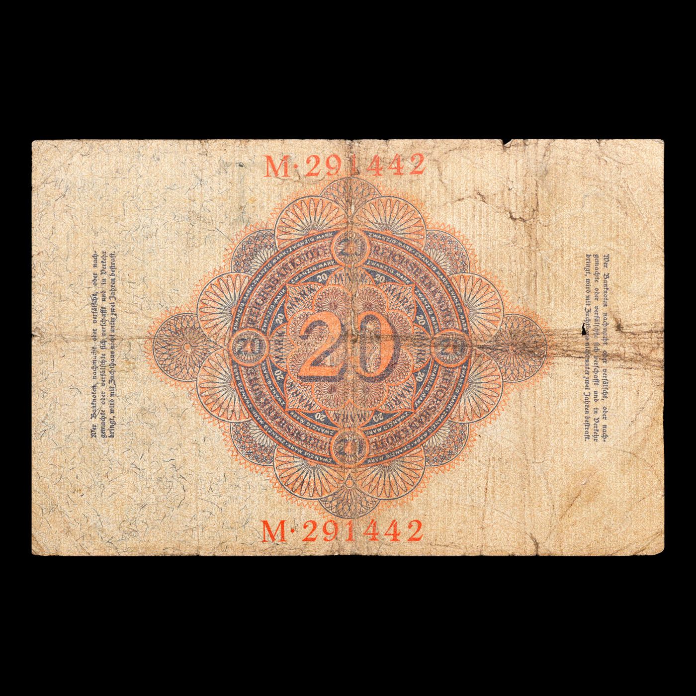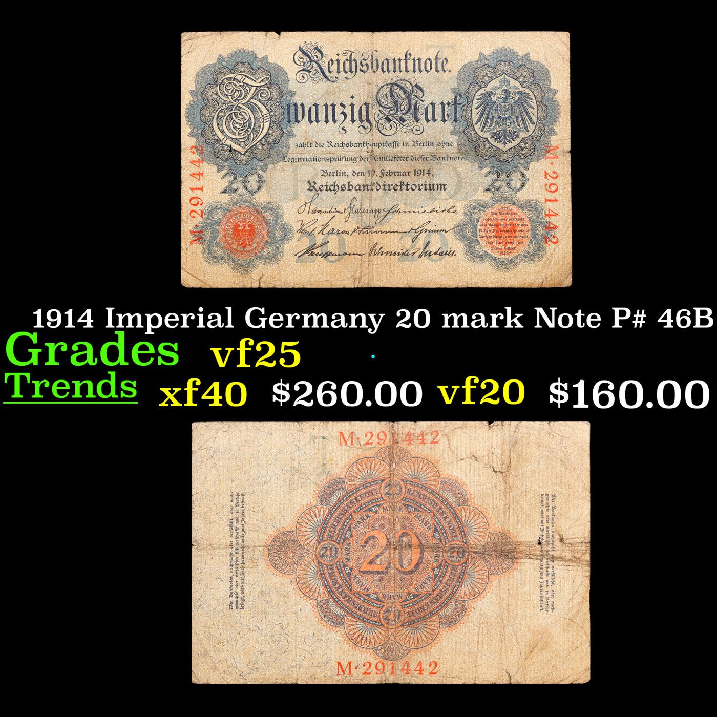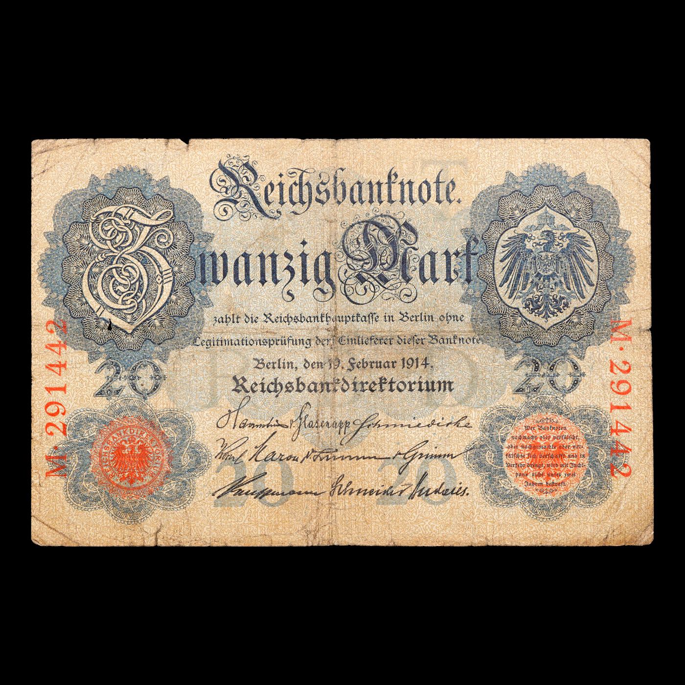 1914 Imperial Germany 20 mark Note P# 46B Grades vf+.