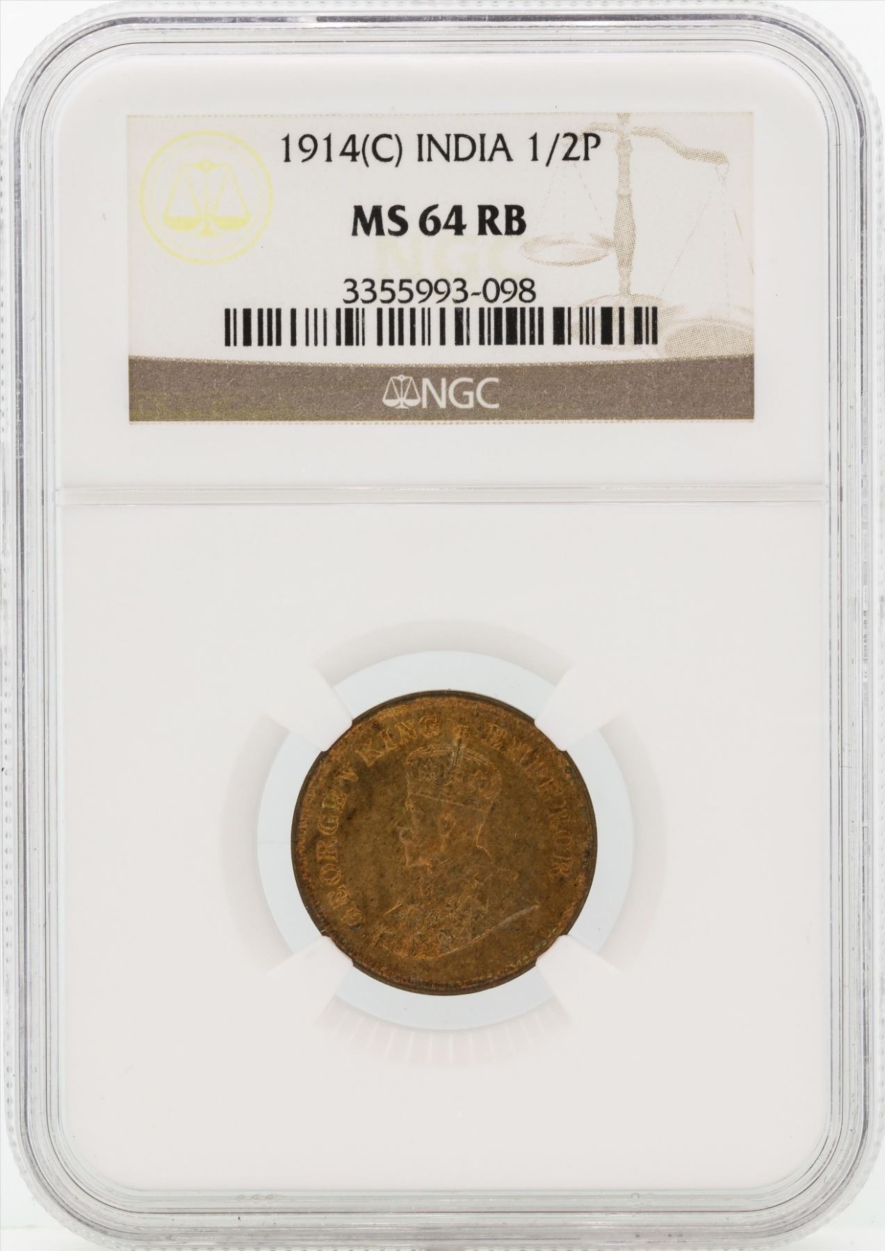 One 1914 India 1/2 Pice Coin NGC MS64RB.