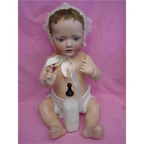 <table width="100%" border="0" cellspacing="0" cellpadding="4"><tr><td><em> </em></td></tr><tr> <td width="100%"> 1914 J D KESTNER 24in BABY HILDA NEEDS TLC. This is a very large example of Baby Hilda with bisque head and composition body. She is fully marked in the back of the head " Made in Germany, 245, JDKestner Jr, HILDA, 1914, C with a circle around it." Her bisque head, although it doesnot show any hairlines or breaks, has been restored professionally and some of the paint is lifting as shown in the photos. The composition body is original and in very good condition. She has the original human hair wig, real teeth, wobble tongue, and big blue eyes that sleep. She wears an antique bonnet(with new ribbons), that might be her original one, and an embroidered white cotton gown or an antique long flowing gown of sheer fabric with flowered embroidery. Buyer can have their pick of either outfit. Albeit her imperfections, this Baby Hilda is still quite charming! This doll, according to Jan Foulke in Blue Book of Dolls & Values, books for $6000-$6500 in good condition. </td></tr><tr> <td> </td></tr><tr> <td>Reference #: 1200000</td></tr><tr><td>Condition:GOOD</td></tr><tr><td>Year:1900</td></tr><tr><td>Maker:KESTNER</td></tr><tr><td>Height:25</td></tr><tr><td>Title:1914 J D KESTNER 24in BABY HILDA NEEDS TLC</td></tr><tr><td>Location:los angeles</td></tr></table>