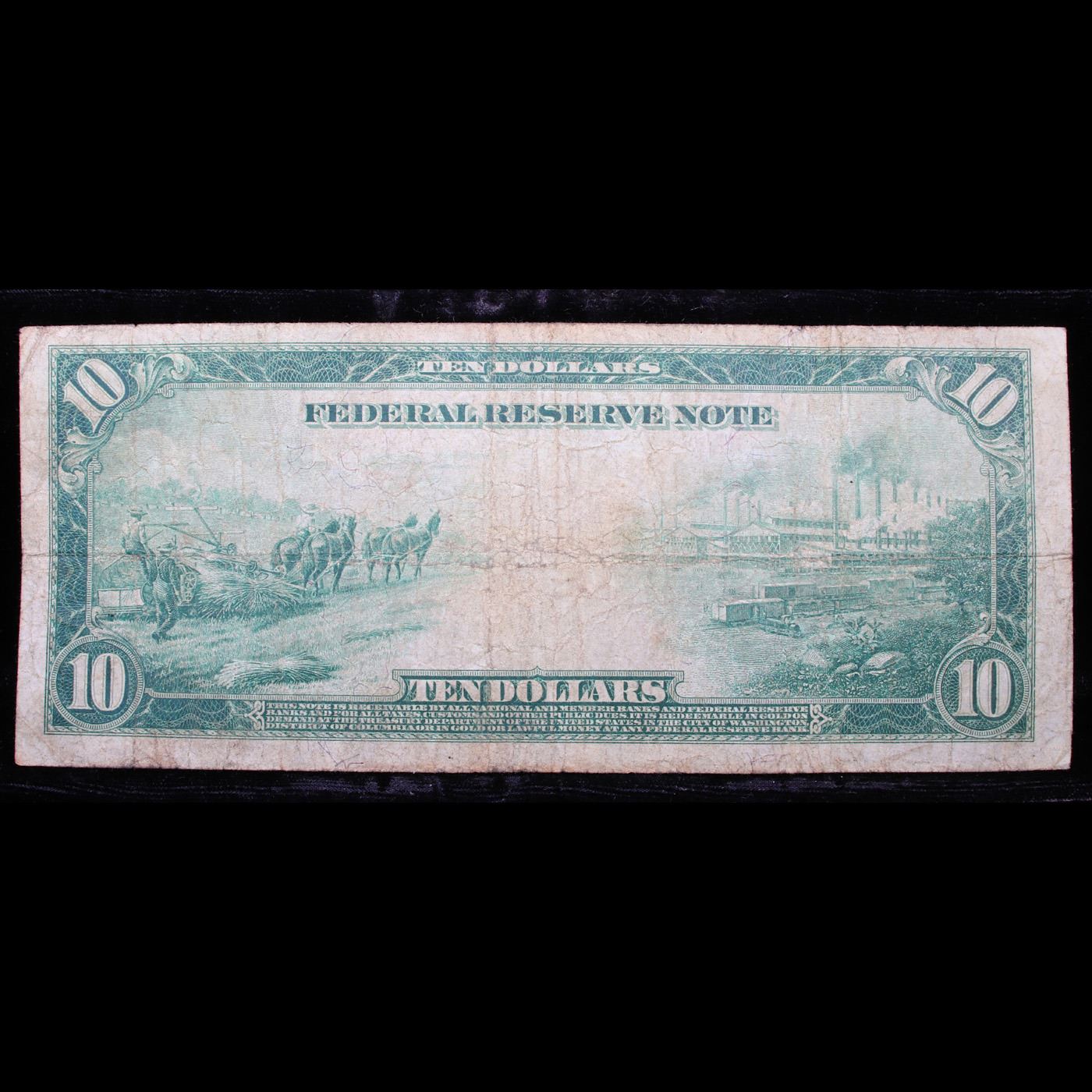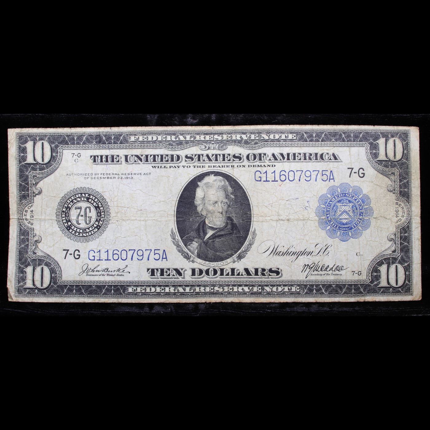 1914 Large Size $10 Blue Seal Federal Reserve Note (Chicago, IL) 7-G Grades vf, very fine. Despite having 1913 written on them, these are actually from the series of 1914, as it says on the right and left hands side of each note. An engraved portrait of President Andrew Jackson is on the note's face and the back features two vignettes titled Farming and Industry