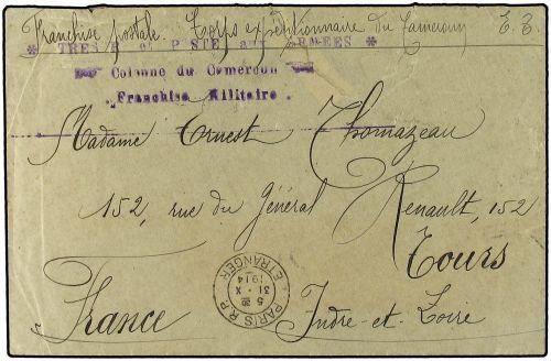 1914 Military mail envelope to FRANCE endorsed CORPS EXPEDITIONNAIRE DU CAMEROUN with military cancel TRESOR ET POSTE AUX ARMEES/COLONNE DU CAMEROUN FRANCHISE MILITAIRE in violet with TOURS arrival on reverse. Very fine and rare.