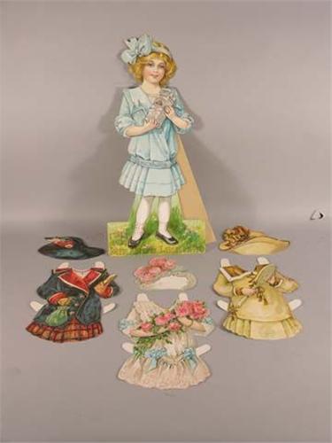 1914 Minard's liniment sign American Lithographic Co. Cardboard/easel back sign comes with 3 dresses/3 hats to change clothes. Rare. Ex. cond. 20.5" tall.