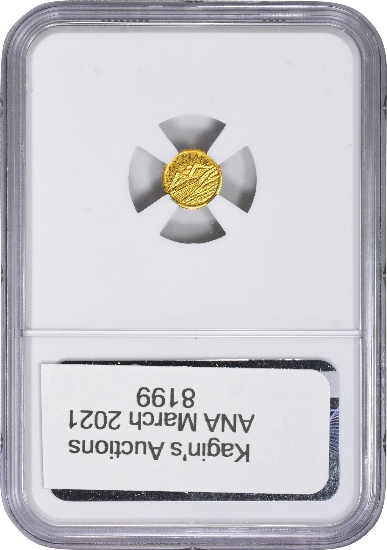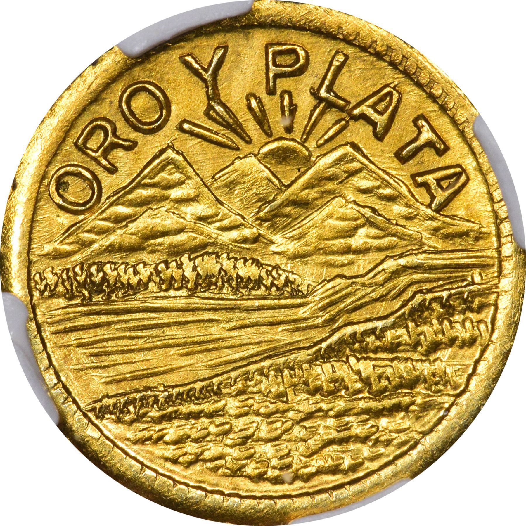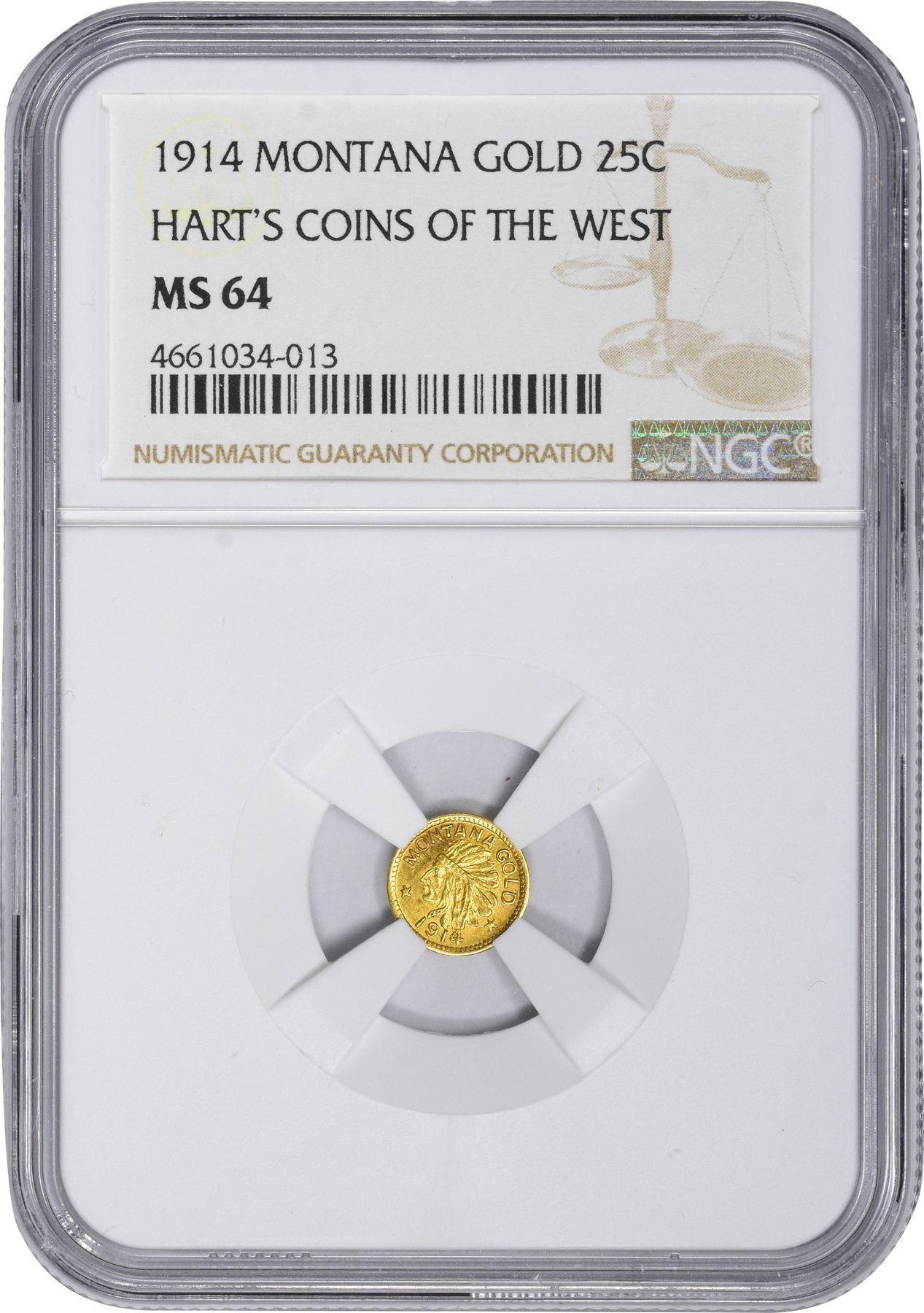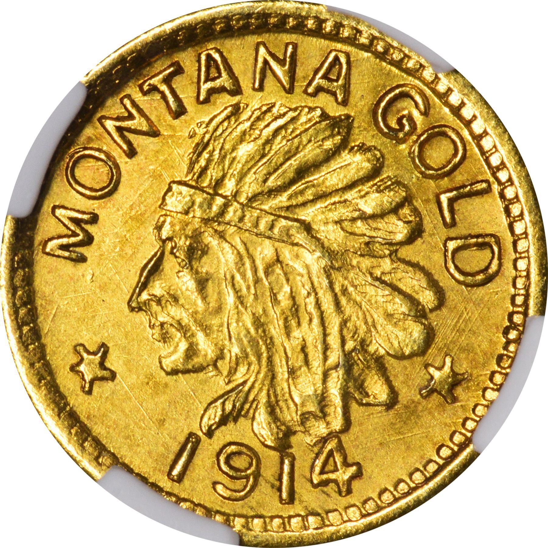 Description: 1914 Montana Gold 25 cent size. Very Choice Uncirculated, well detailed. NGC MS 64.