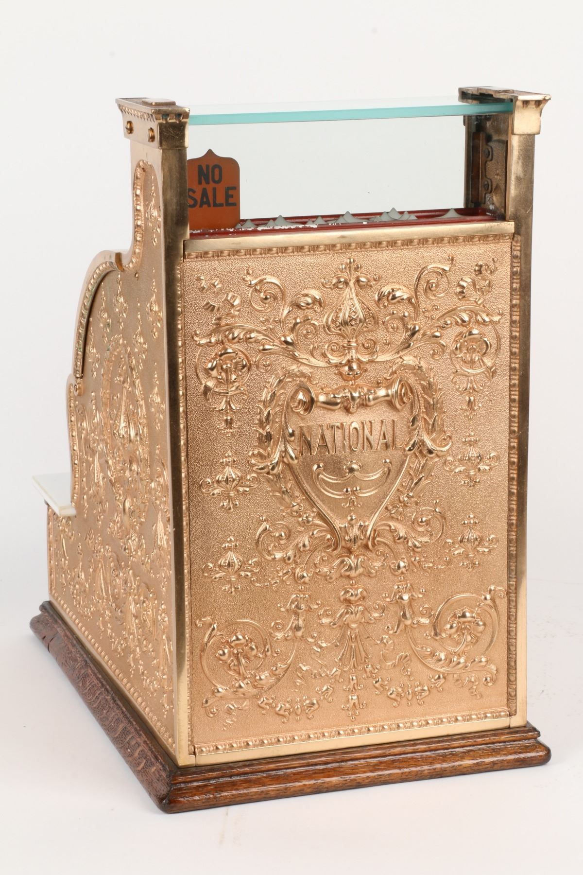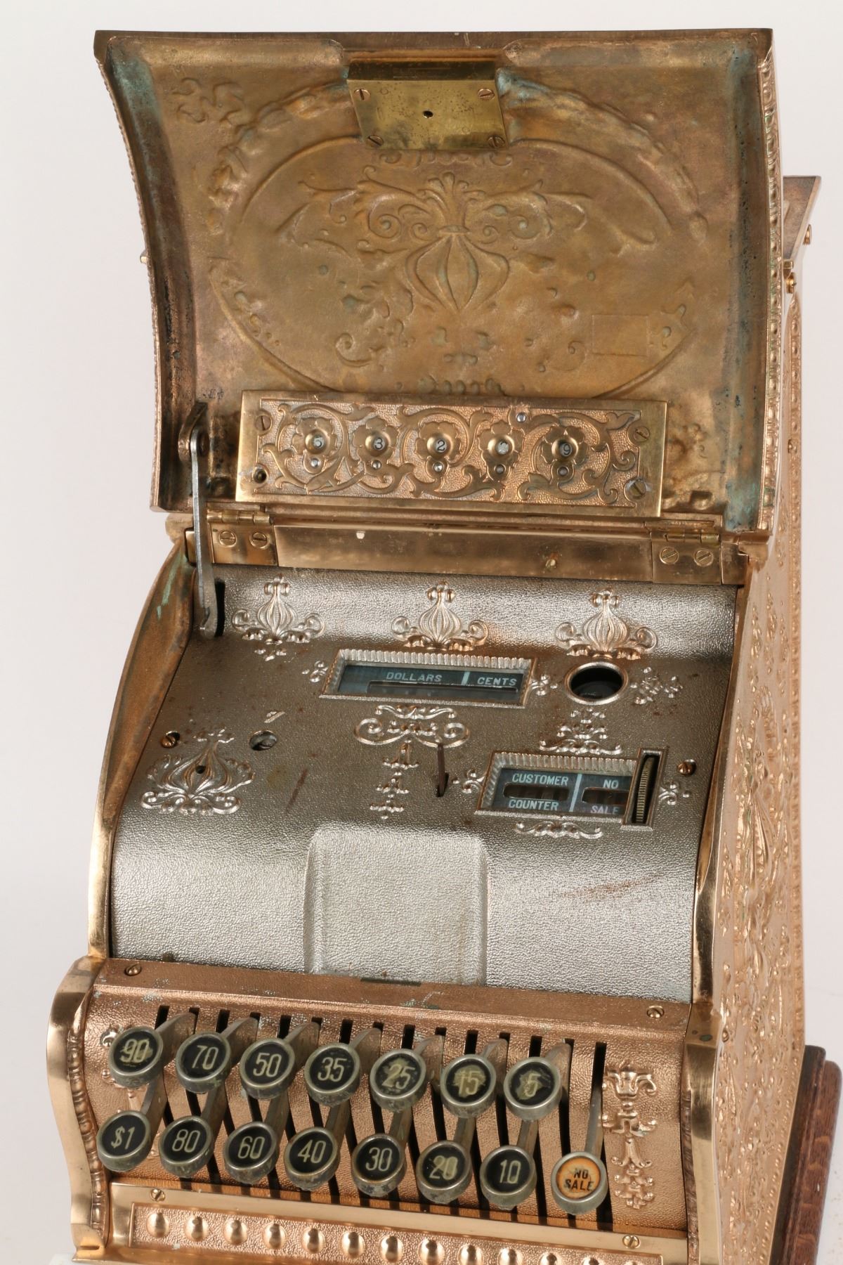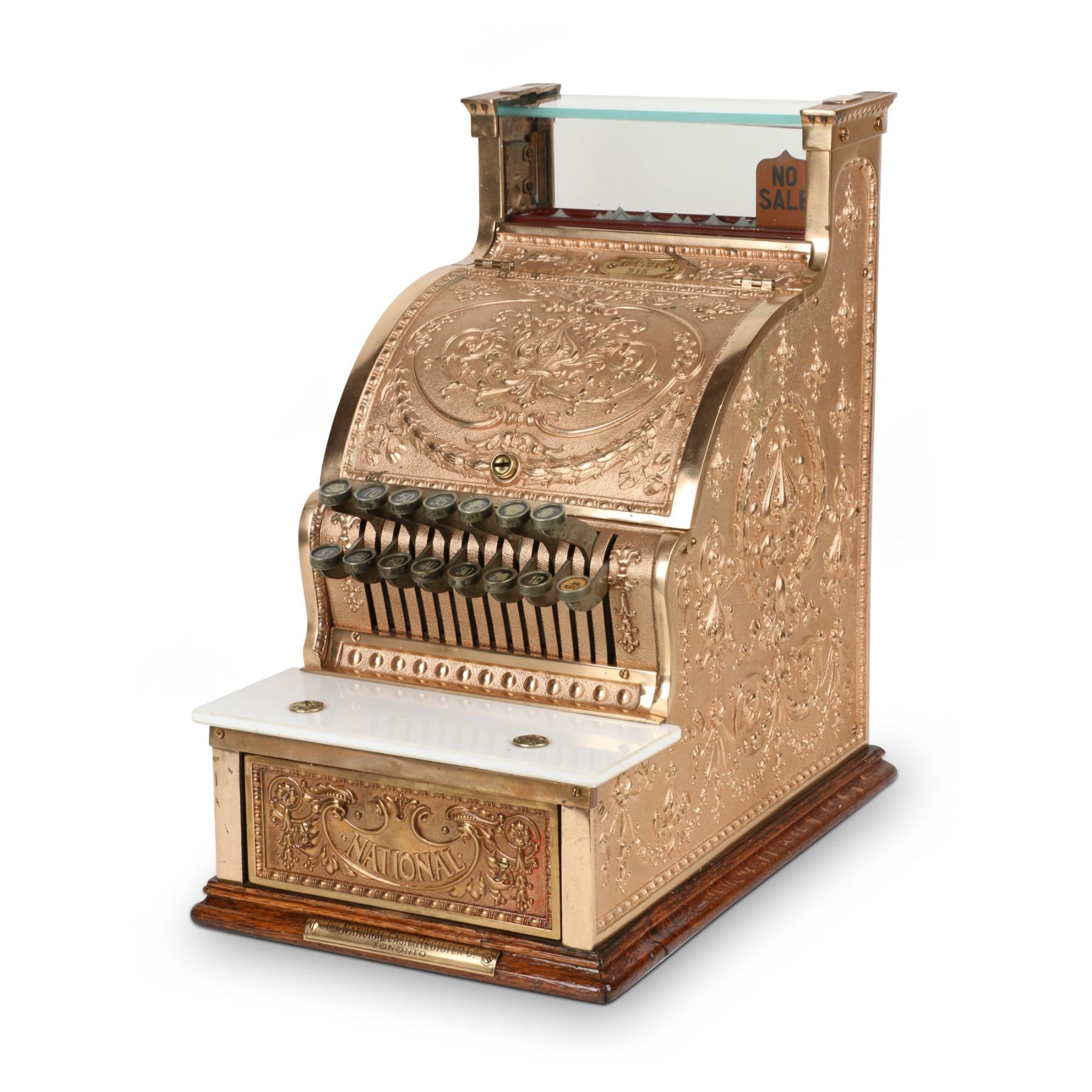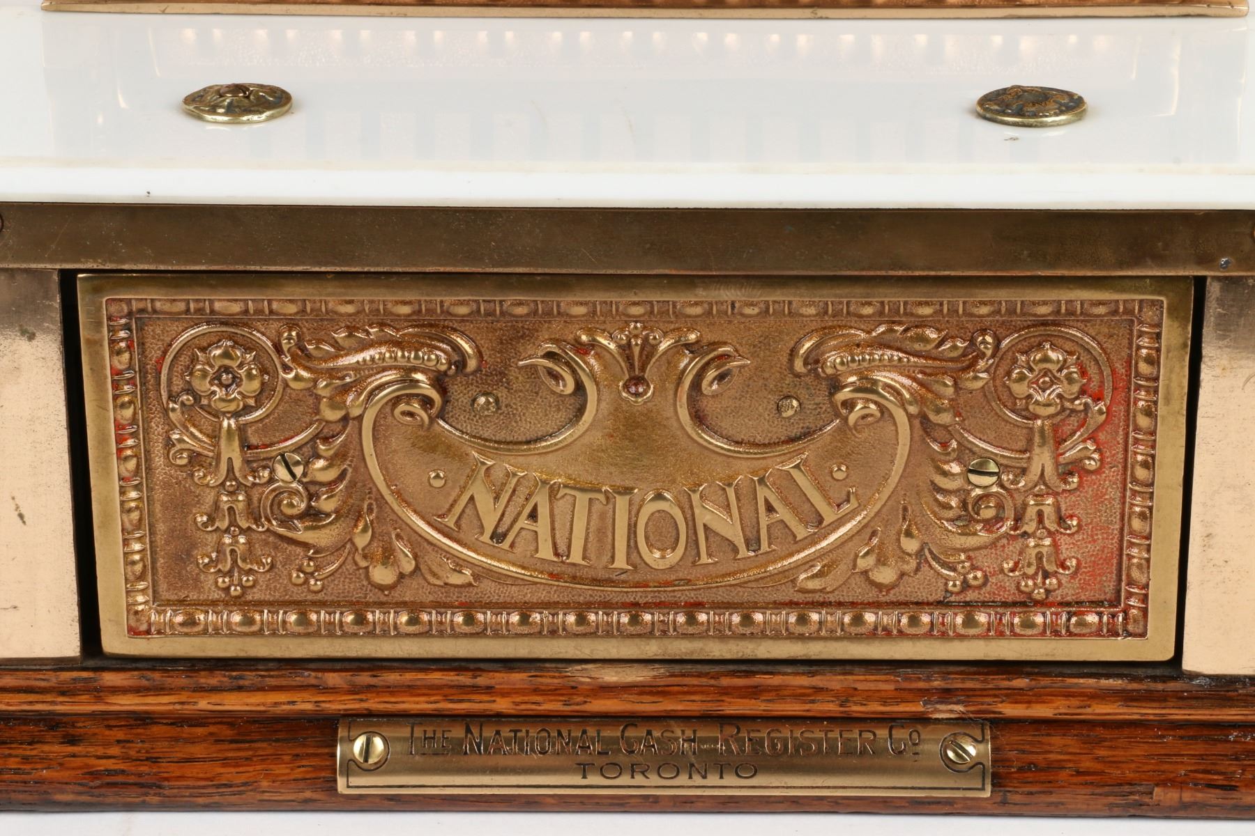 Canadian. Toronto. 1914. National Cash Register Co. Plate stamped, "1347914 313". Outfitted with counter mechanism underneath lid plate. 10" x 17" x 16". Professionally restored and polished. Original label attached beneath till drawer. Requires banner. 800-1200.