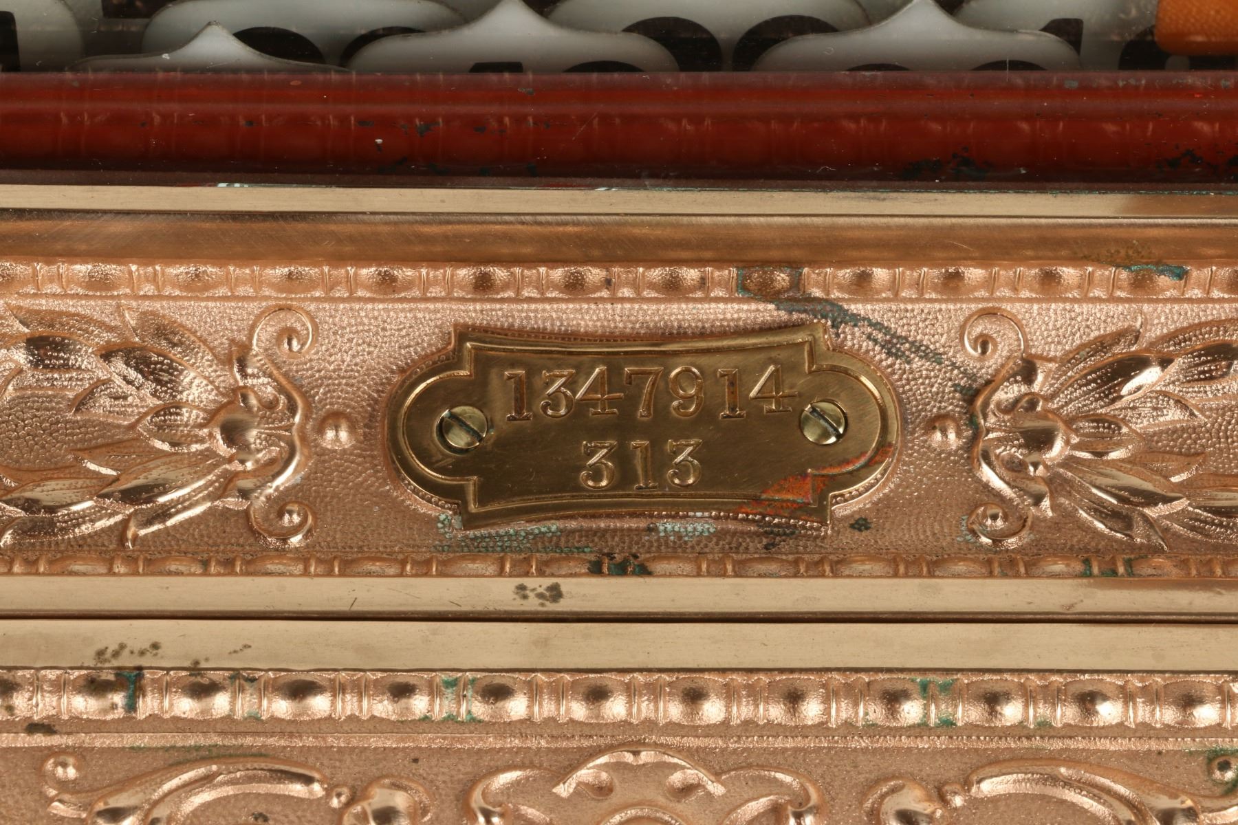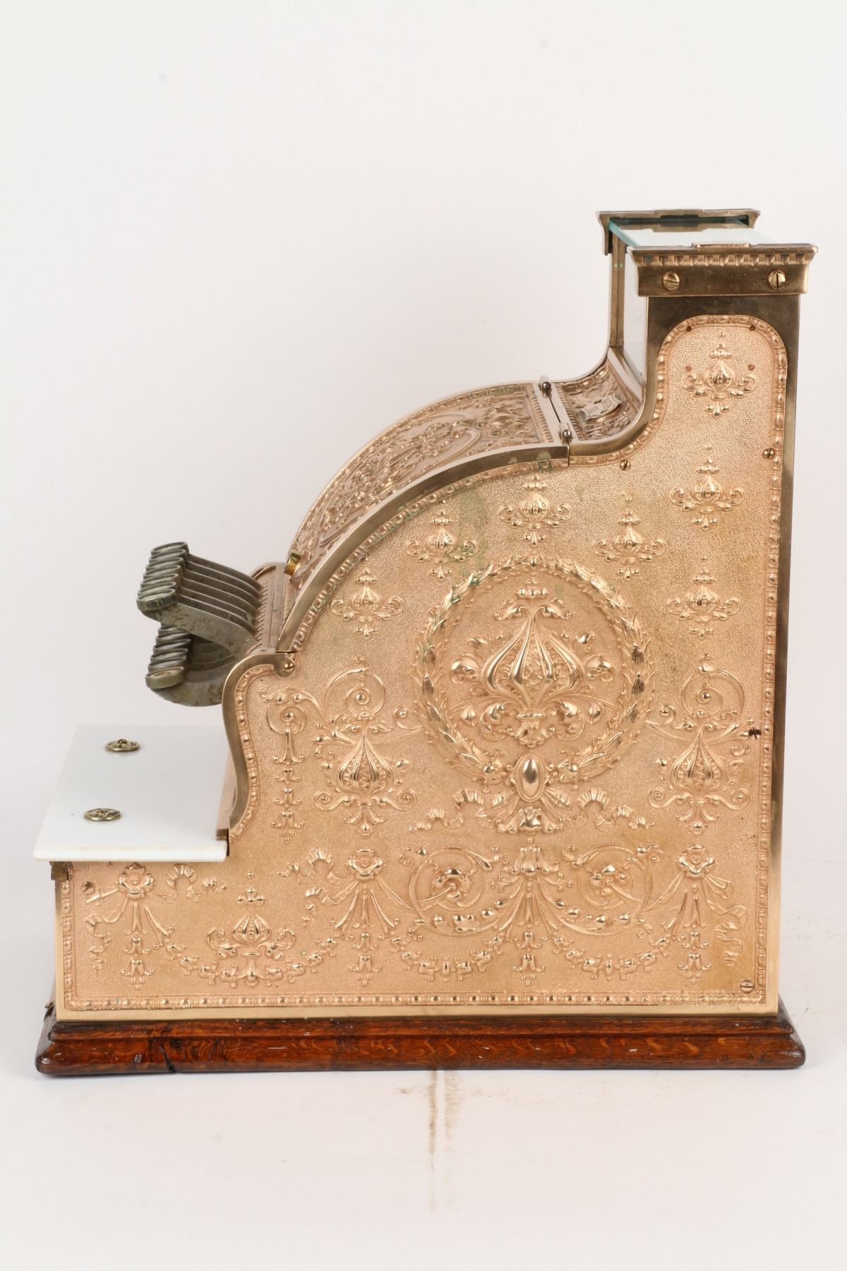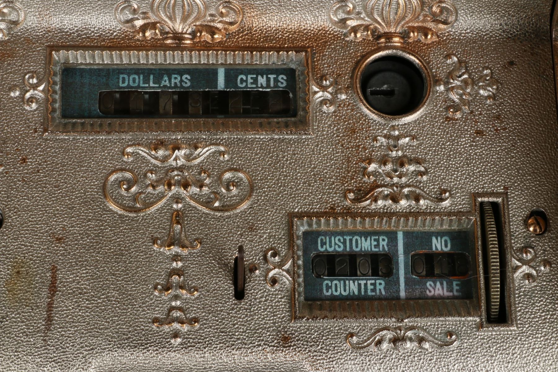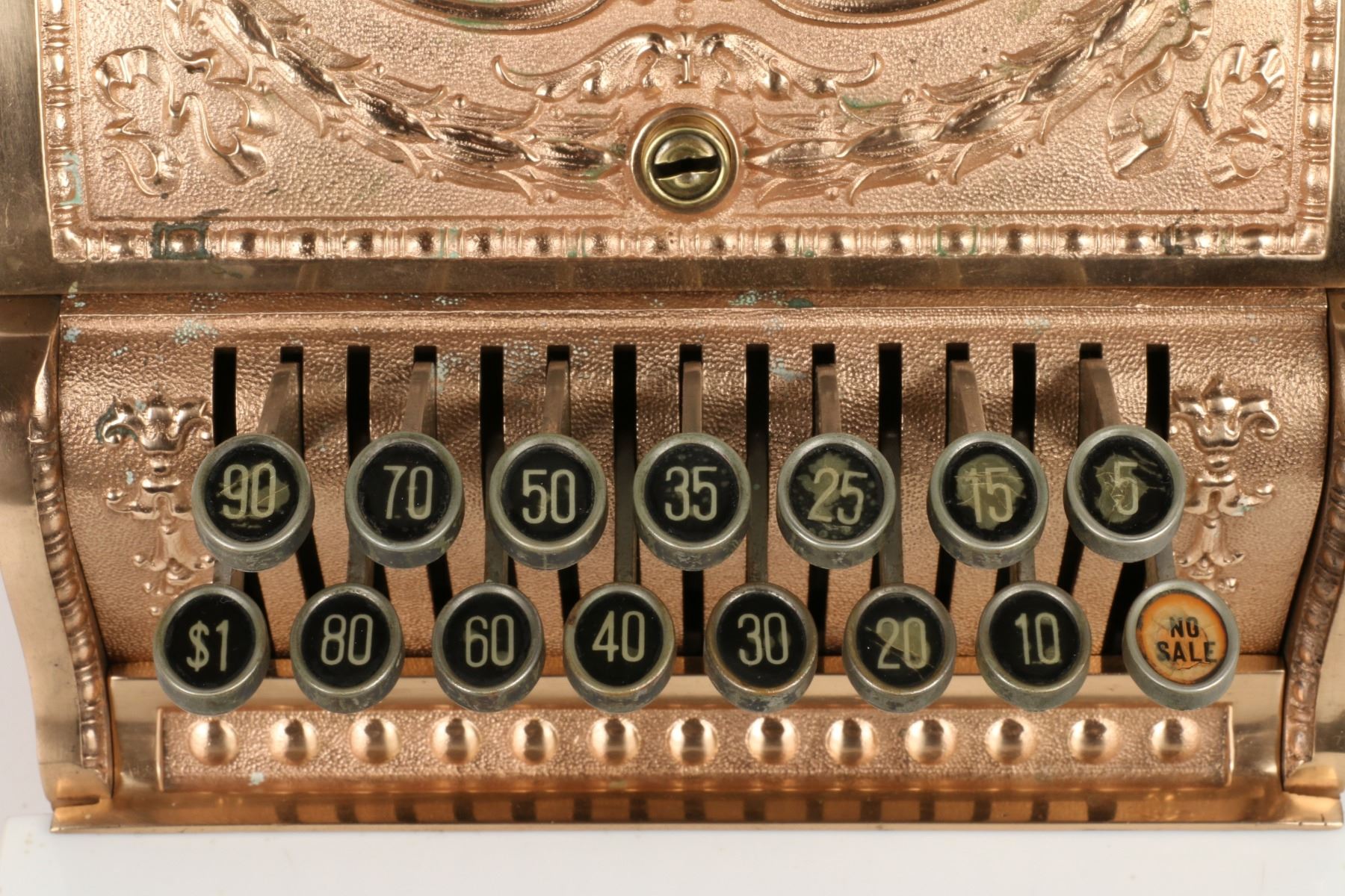 Canadian. Toronto. 1914. National Cash Register Co. Plate stamped, "1347914 313". Outfitted with counter mechanism underneath lid plate. 10" x 17" x 16". Professionally restored and polished. Original label attached beneath till drawer. Requires banner. 800-1200.