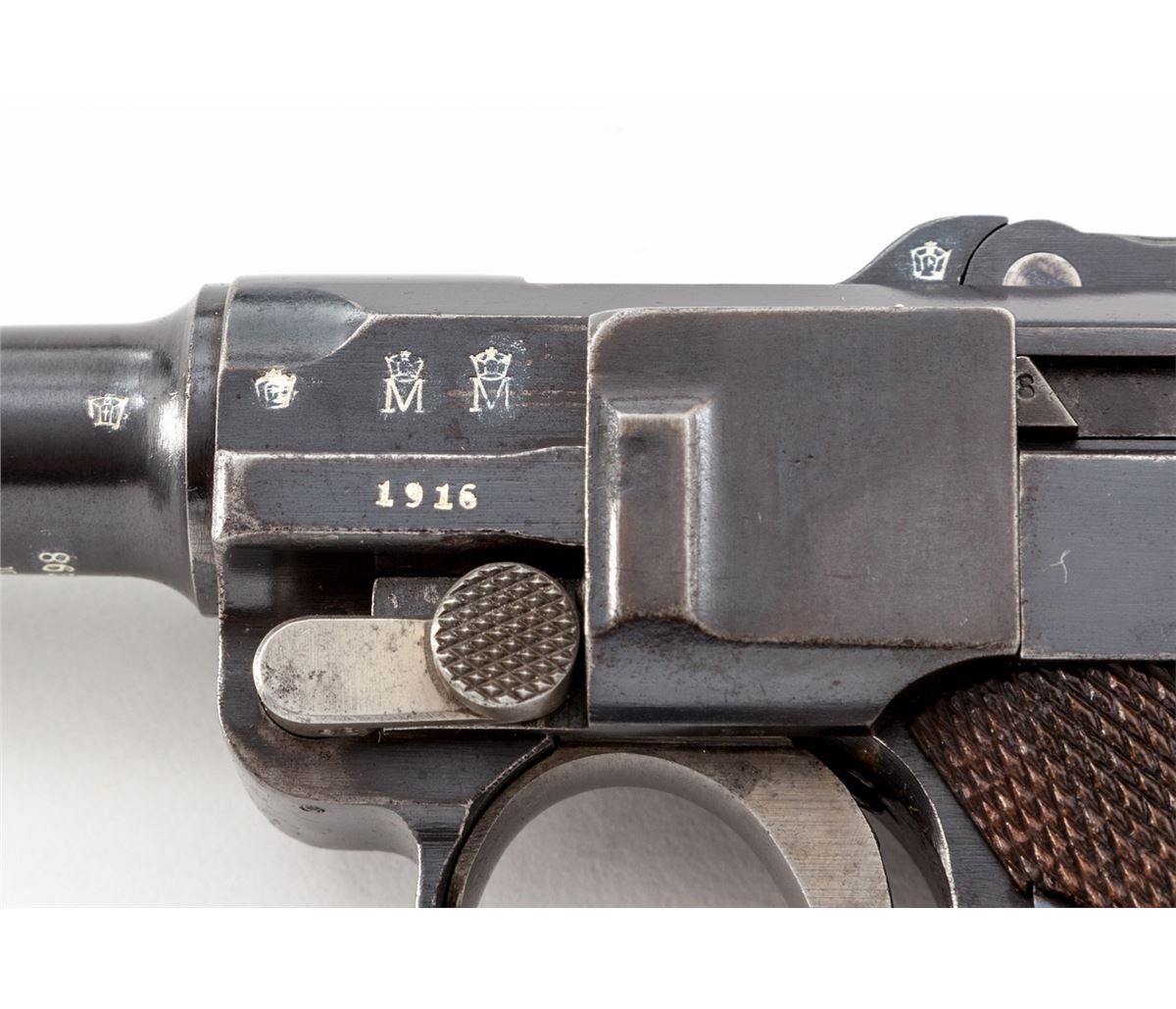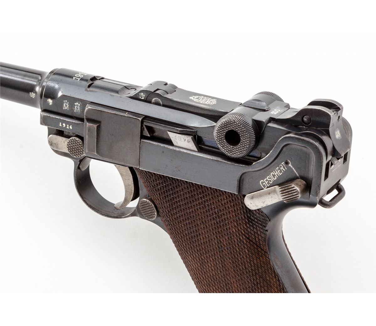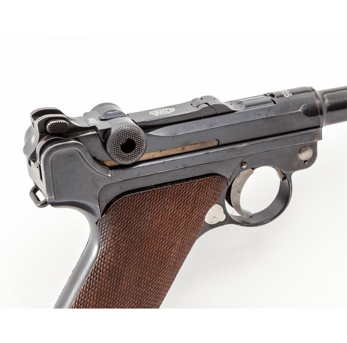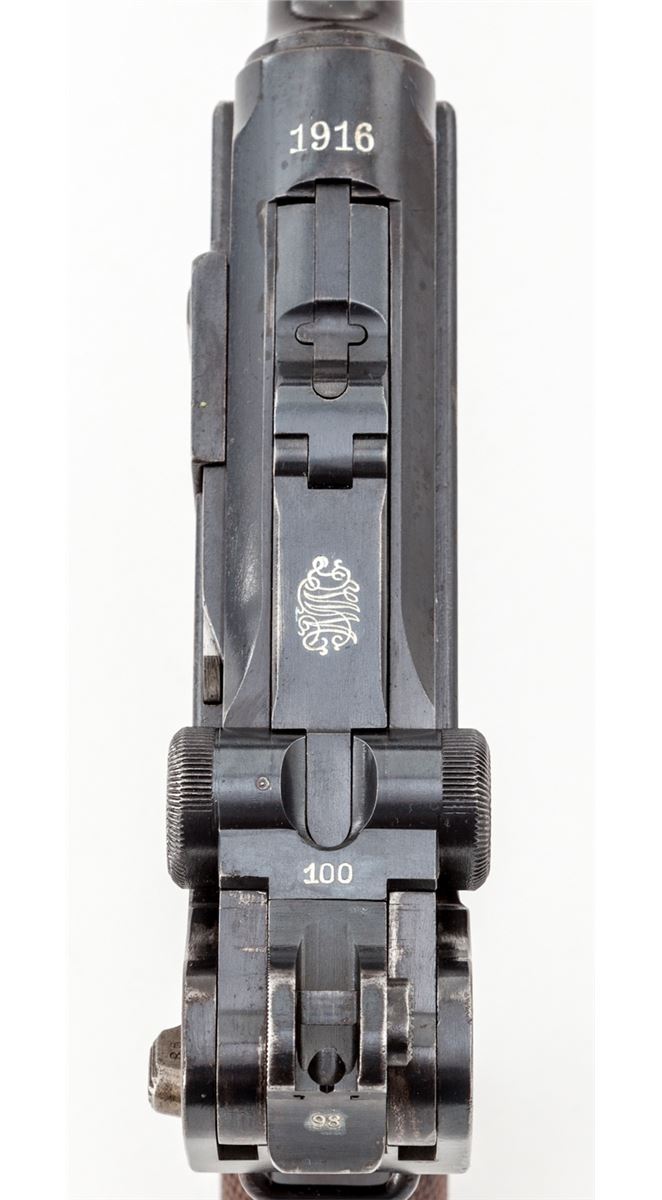 1914 Navy Luger, by DWM, #4298, 9mm, 6'' barrel, blue finish with straw small parts, checkered walnut grips, and one correct matching numbered tin-plated magazine with ringed walnut base and naval proofmark. Top of chamber marked 1916, central toggle link marked DWM, with two-position graduated rear sight, and ''(crown)/M'' proofmarks. Forward left portion of frame and front sight base marked ''1916''. Considered quite scarce with only 8000 mfg'd in 1916. Condition is excellent retaining approx. 97% lightly thinning and toning blue, with some thinning in actioning areas. Grips with very minor flattening. All visible matching numbers. Action is crisp, bore shows some frosting in the grooves as is typical with this period military firearm. Est.: $3,000-$5,000. (C&R/PPT) (John Siroonian estate)