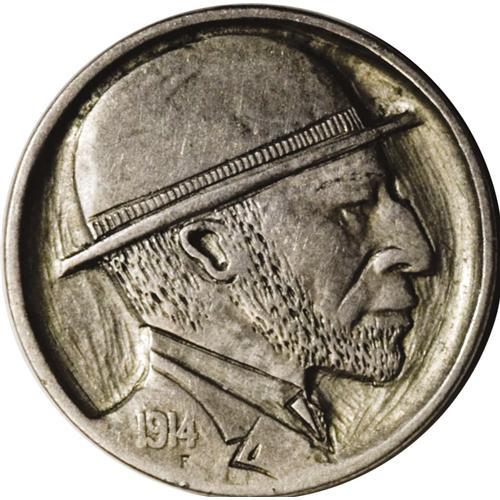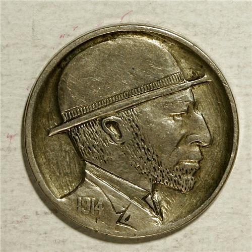 <B>1914-P:</B></I> A Classic (original) carving on a Very Fine coin, this is another cameo offering, this one with a raised rim around the subject. Again, by an unknown artist. Very nicely detailed high domed hat with a vertically striped, thin hatband. The profile has been altered; light hair, beard (no moustache, which is somewhat unusual on bearded subjects), and an eyebrow. A winged collar shirt and a coat with a buttonhole in the lapel add to the overall attractiveness of this coin. The field has been rather roughly dressed, but it is certainly not detracting.<BR><BR><b>Shipping:</b> Coin/Currency (<a target="_blank" href="http://www.heritageauctions.com/common/shipping.php">view shipping information</a>)