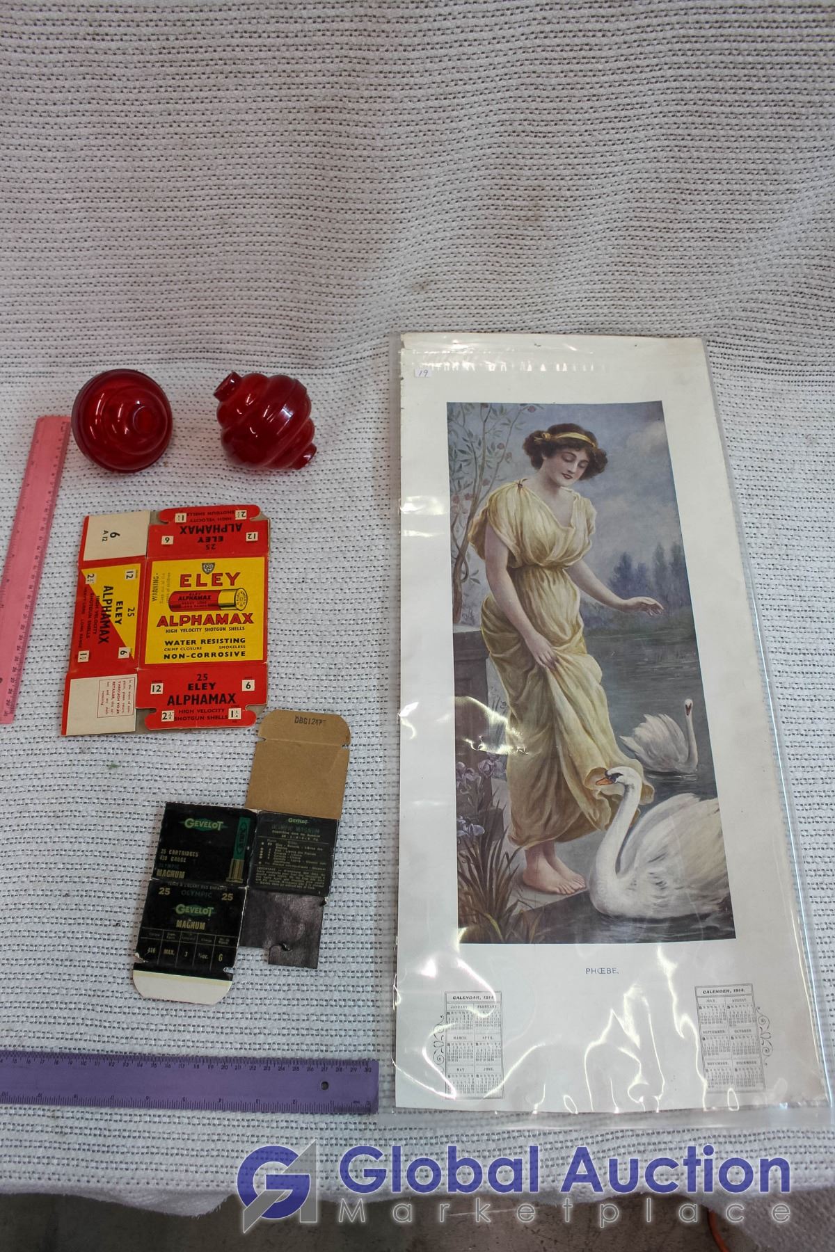 1914 Phebe Calendar, Ammo Boxes (2) Plastic Globes (2)