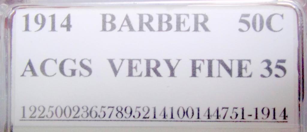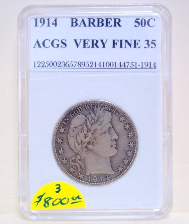Key Date 1914 Philadelphia Mint Barber Half Dollar. This coin is ACGS Certified Very Fine-35. This is the most sought after, rarest coin in the Barber Half Dollar series. With less than 125,000 pieces minted, it has the lowest mintage of any coin in the series. A great investment for future generations with unlimited upward potential.