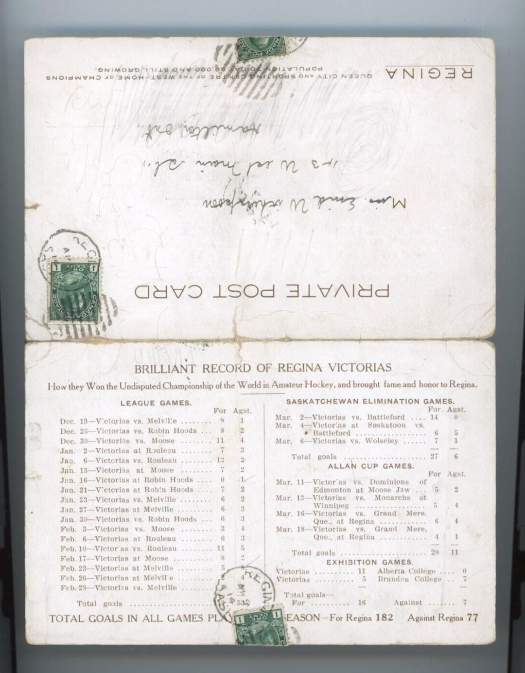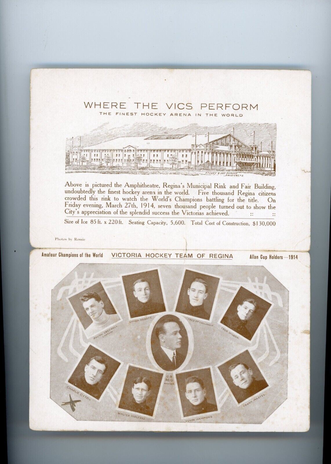 VERY GOOD Year: 1914 POSTMARKED 1914 WITH 2 STAMPS. *RARE FOLDOUT POSTCARD OF THE FAMOUS REGINA VICTORIA'S HOCKEY TEAM, WHO ARE WINNERS OF THE ALLAN CUP. LIGHT WRITING AND PENCIL MARKS ALONG WITH THE ADDRESS ON THE FRONT OF THE POSTCARD. WHICH IS OVERALL CONDITION IS VERY GOOD. CREASE DOWN MIDDLE AND 3/4" AND 1" SPINE SPLIT ALONG THE HORIZONTAL FOLD. T IS AN INK X UNDER CHARLEY OTTON. THE INSIDE OF THE CARD FEATURES A PICTURE OF THE AREA. T IS A TEAM SHOT. T IS A SMALL 1/4" TEAR, ON THE RIGHT HAND BOARDER OF EACH CARD. QUOTE BELOW THE HOCKEY ARENA PICTURE: "ABOVE IS PICTURED THE AMPHITHEATRE, REGINA'S MUNICIPAL AND FAIR BUILDING, UNDOUBTEDLY THE FINEST HOCKEY ARENA IN THE WORLD. FIVE THOUSAND REGINA CITIZENS CROWDED THIS RINK TO WATCH THE WORLD'S CHAMPOPMS BATTLING FOR THE TITLE. ON FRIDAY EVENING, MARCH 27TH, 1914, SEVEN THOUSAND PEOPLE TURNED OUT TO SHOW THE CITY'S APPRECIATION OF THE SPLENDID SUCCESS THE VICTORIAS ACHIEVED."