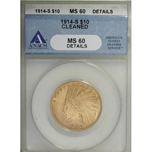 <B>1914-S $10 --Cleaned--ANACS. MS60 Details.</B></I> NGC Census: (14/321). PCGS Population (11/350). Mintage: 208,000. Numismedia Wsl. Price for NGC/PCGS coin in MS60: $775. (#8877)<BR><BR><B>Coin Engraver:</B> Augustus Saint-Gaudens<BR><BR><b>Shipping:</b> Coins & Currency (<a target="_blank" href="http://www.heritageauctions.com/common/shipping.php">view shipping information</a>)