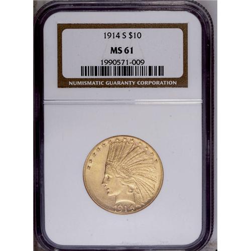 <B>1914-S<$10> MS61 NGC.</B></I> A lustrous and generally smooth honey-gold better date Indian eagle with a couple of light marks near the chin and an arc of striking softness to the 19 in the date. The mintmark is repunched southeast.