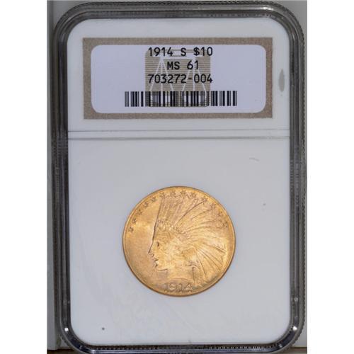 <B>1914-S<$10> MS61 NGC.</B></I> Straw-gold in the center and amber at the periphery, this coin has great luster and a nice strike for this issue. Myriad abrasions over both sides restrict the grade.