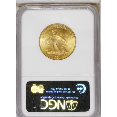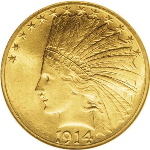 <B>1914-S $10 MS64 NGC.</B></I> The 1914-S ten dollar, with a mintage of just 208,000 pieces, is a scarce issue in any condition. This near-Gem exhibits potent luster and peach-gold color with undertones of mint-green. The design features are well impressed, with nice definition apparent in the Indian's bonnet and on the eagle's feathers. A couple of minor marks prevent a higher grade. Census: 43 in 64, 16 finer (11/06).<BR><BR><b>Shipping:</b> Coin/Currency (<a target="_blank" href="http://www.heritageauctions.com/common/shipping.php">view shipping information</a>)
