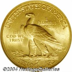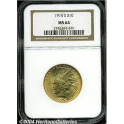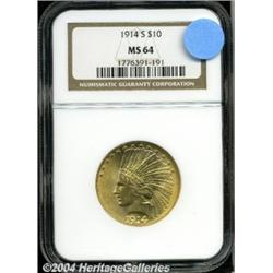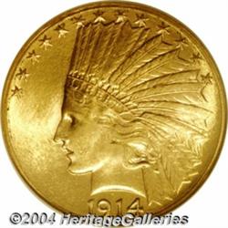 <B>1914-S<$10> MS64 NGC.</B></I> Among San Francisco Mint Indian Eagles, the 1914-S is similar in rarity to the 1910-S and 1912-S. It has been suggested that only 100 of the extant examples are Mint State, but all that we can say with certainty based on current NGC and PCGS population reports is that the rarity of this date increases dramatically the closer one gets to the Gem threshold. Far superior to the typically offered survivor, this lovely coin is richly endowed with frosty luster. Every design element, from the Indian's feathered headdress to the S mintmark, is sharply brought up. A yellow-gold example that would do justice to an advanced Indian Eagle collection.<BR><I>From The Sarasota Collection.</B></I> <BR><BR><B>Important notice:</B> Heritage usually auctions material at the rate of 200-250 lots per hour. On some occasions eBay Live bid software or the Internet may not be able to keep up with the pace of the auction. We recommend placing a realistic absentee bid now as insurance to avoid disappointment. Occasionally the auctioneer may eliminate or reject an eBay Live bid, and the auctioneer may also reopen a lot after the close of the eBay live bidding (usually because we missed an audience bid), and may reject your bid even if it shows you as the winning bidder. By bidding via eBay Live, you agree that Heritage may award the lot to another bidder at its sole discretion under the circumstances described above or any other reasonable circumstances. Since eBay bids are not shown to us until we open the lot on the floor, we treat those bids just like floor bids. In most cases the floor responds before the eBay bid is presented to us, due to Internet lag time, so for consistency we have made it a policy that floor bids are always considered first over tie eBay live bids. Also please note that all Heritage lots purchased through eBay Live carry a 20% Buyer's Premium. Please make sure you read the Terms and Conditions before you bid. </span></font></tr></table></td></tr></table>