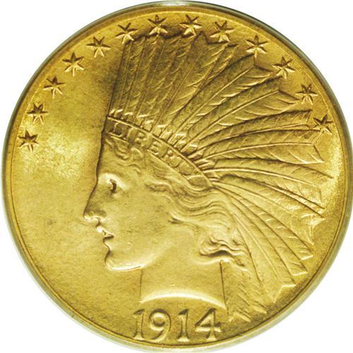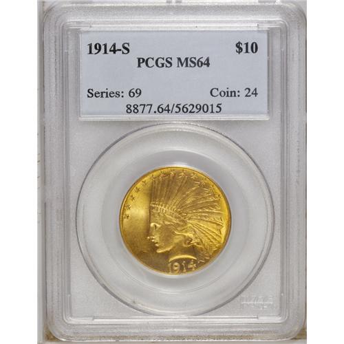 <B>1914-S $10 MS64 PCGS.</B></I> The visually enticing coloration is a wonderful mixture of fiery copper-red and lime-green. Effulgent luster illuminates the satiny surfaces that show a minimal number of marks for the grade. The strike is sharp with strong obverse and reverse design features. While not the rarest S-mint Indian eagle, the 1914-S is still an important issue, especially at the Choice Uncirculated level of preservation. As the population data reveals, this date is a condition rarity in MS64 or finer grades. Population: 77 in 64, 11 finer (12/06).<BR><BR><b>Shipping:</b> Coin/Currency (<a target="_blank" href="http://www.heritageauctions.com/common/shipping.php">view shipping information</a>)