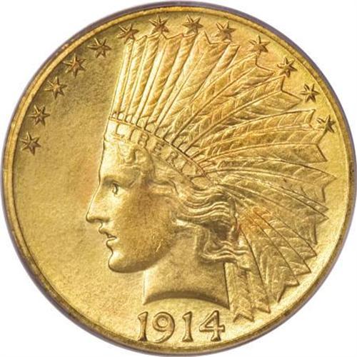 <B>1914-S $10 MS64 PCGS.</B></I> This date often represents a road block for collectors striving to complete a high-end set of ten dollar Indians. Specialists of this Saint-Gaudens' designed issue are well aware of that fact, and a review of the PCGS <I>Population Report</B></I> supports the claim; only 79 pieces have been graded at this level with a mere 10 grading finer (3/08). And, of course, those numbers are artificially high for obvious reasons. Garrett-Guth agreed when they wrote in 2006 that the '14-S ten is "one of the more conditionally challenging dates" in the series. This lovely coin has thick mint luster that shows slightly variegated golden-yellow, lilac, and rose colors. The finely granular surfaces do not show any significant abrasions on either side.<BR><BR><B>Coin Engraver:</B> Augustus Saint-Gaudens<BR><BR><b>Shipping:</b> Coins & Currency (<a target="_blank" href="http://www.heritageauctions.com/common/shipping.php">view shipping information</a>)