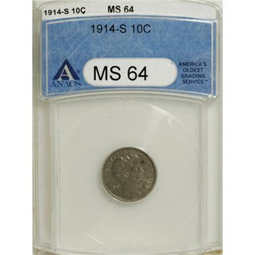 <B>1914-S 10C MS64 ANACS.</B></I> NGC Census: (41/27). PCGS Population (35/27). Mintage: 2,100,000. Numismedia Wsl. Price for NGC/PCGS coin in MS64: $535. (#4867)<BR><BR><B>Coin Engraver:</B> Charles E. Barber<BR><BR><b>Shipping:</b> Coins & Currency (<a target="_blank" href="http://www.heritageauctions.com/common/shipping.php">view shipping information</a>)