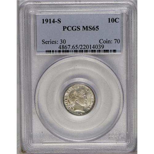 <B>1914-S<10C> MS65 PCGS.</B></I> Boldly struck overall and immaculately preserved, with bright satiny luster and a slight degree of speckled reddish-brown patina on the obverse. A pleasing Gem representative of this late San Francisco issue. Population: 13 in 65, 9 finer (5/06).