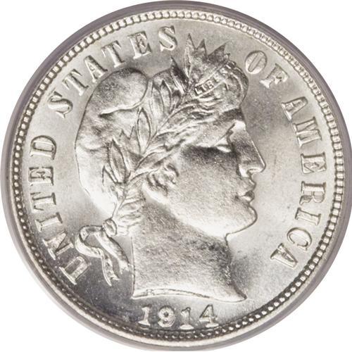 <B>1914-S 10C MS66 PCGS.</B></I> A stone-white and completely brilliant piece, this charming coin would likely garner an even finer grade were it not for a couple of minor slide marks seen on Liberty's cheek under a loupe. The reverse offers moderate cameo contrast. A nearly unimprovable coin, as PCGS has certified only a single coin finer for the issue (4/07).<BR><BR><b>Shipping:</b> Coins & Currency (<a target="_blank" href="http://www.heritageauctions.com/common/shipping.php">view shipping information</a>)