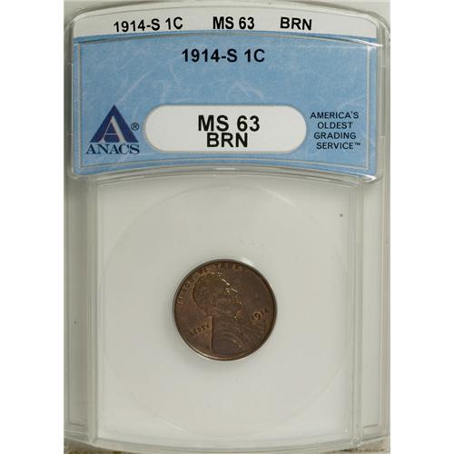 1914-S 1C MS63 Brown ANACS. NGC Census: (44/76). P