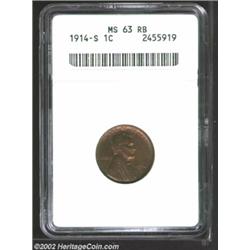 1914-S 1C MS63 Red and Brown ANACS. Orange-gold color outlines the borders and devices. The surfaces are well preserved, while the strike has a hint of weakness before the O in ONE. A scarce early branch mint issue. Important notice: We expect to be auctioning lots at the rate of 200-250 per hour. Sometimes eBay Premier live bid software cannot keep up with that pace, so we strongly recommend that you place a realistic proxy bid now as insurance to avoid disappointment. Also please note that all Heritage/CAA lots purchased through eBay Premier carry a 20% Buyer's Premium. Please make sure you read the Terms and Conditions.