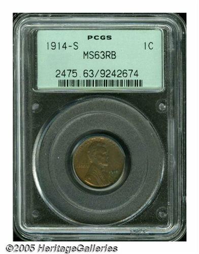 <B>1914-S<1C> MS63 Red and Brown PCGS.</B></I> The pale-gold color deepens in lilac hues on the left obverse of this boldly struck piece. Traces of aqua verdigris require mention. A scarce early branch mint issue. Housed in a green label holder.