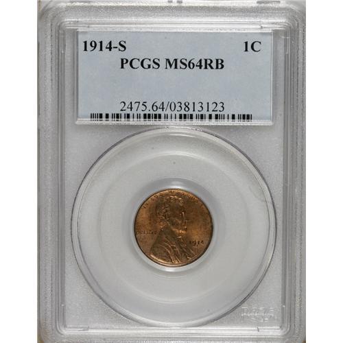 <B>1914-S 1C MS64 Red and Brown PCGS.</B></I> PCGS Population (106/0). NGC Census: (35/27). Mintage: 4,137,000. Numismedia Wsl. Price for NGC/PCGS coin in MS64: $765. (#2475)<BR><BR><b>Shipping:</b> Coins & Currency (<a target="_blank" href="http://www.heritageauctions.com/common/shipping.php">view shipping information</a>)