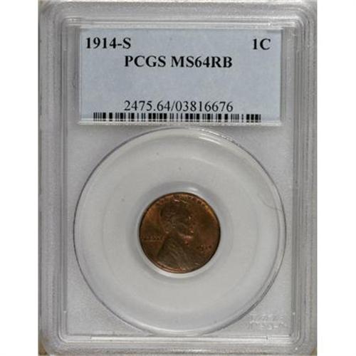 <B>1914-S 1C MS64 Red and Brown PCGS.</B></I> Though not as celebrated as its D-mint counterpart, the 1914-S cent presents a legitimate challenge in finer grades. Streaks of orange and glints of ruby punctuate the otherwise violet-brown surfaces of this near-Gem, well struck and free of major distractions.<BR><BR><b>Shipping:</b> Coins & Currency (<a target="_blank" href="http://www.heritageauctions.com/common/shipping.php">view shipping information</a>)