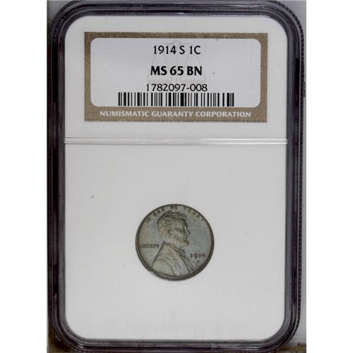 <B>1914-S<1C> MS65 Brown NGC.</B></I> Glossy bluish-brown surfaces yield well executed design elements. A few light handling marks are visible in the right obverse field. Census: 8 in 65, 1 finer (3/06). <BR><BR><B>Important notice:</B> Heritage usually auctions material at the rate of 200-250 lots per hour. On some occasions eBay Live bid software or the Internet may not be able to keep up with the pace of the auction. We recommend placing a realistic absentee bid now as insurance to avoid disappointment. Occasionally the auctioneer may eliminate or reject an eBay Live bid, and the auctioneer may also reopen a lot after the close of the eBay live bidding (usually because we missed an audience bid), and may reject your bid even if it shows you as the winning bidder. By bidding via eBay Live, you agree that Heritage may award the lot to another bidder at its sole discretion under the circumstances described above or any other reasonable circumstances. Since eBay bids are not shown to us until we open the lot on the floor, we treat those bids just like floor bids. In most cases the floor responds before the eBay bid is presented to us, due to Internet lag time, so for consistency we have made it a policy that floor bids are always considered first over tie eBay live bids. Also please note that all Heritage lots purchased through eBay Live carry a 20% Buyer's Premium. Please make sure you read the Terms and Conditions before you bid. This lot is being auctioned in conjunction with a live floor auction by Heritage Galleries & Auctioneers. All final auction and invoice information will be supplied by Heritage Galleries & Auctioneers, and all other information should be considered preliminary. Lot:619 <BR><BR><B>Winning Notification and Billing:</B> After the FINAL session in this auction is complete, Heritage will send e-mail and snail mail invoices. This process normally takes several days. All final auction and invoice information will be supplied by Heritage Galleries & Auctioneers, and all other information should be considered preliminary. <BR><BR>This auction will be conducted on a live auction floor and over the Internet through eBay Live. If you choose to place an absentee bid, please take a moment to <font color='#0000ff'><u><a href='http://pages.ebay.com/liveauctions/help/before/laabsentee.html'>learn how eBay Live absentee bidding works</a></u></font><font color='#000000'>